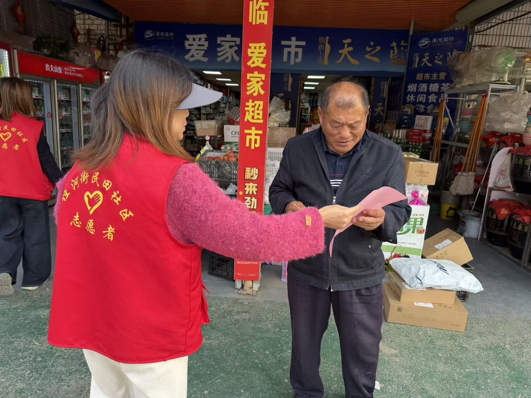 社区工作人员和志愿者入户发放秋季消防安全宣传单