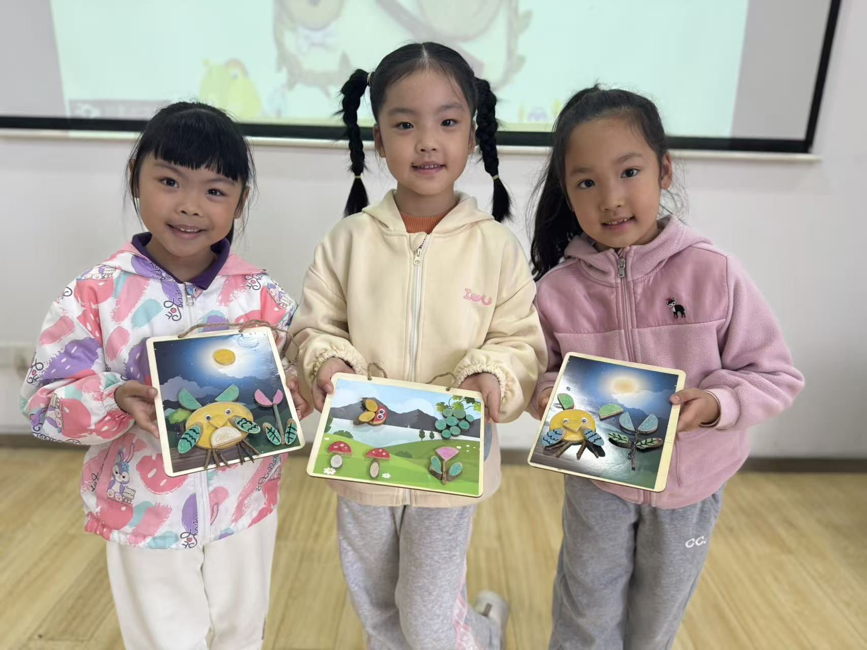 有的孩子把树枝巧妙地拼成了“小花”,花瓣的形状栩栩如生,仿佛在微风中轻轻摇曳;有的孩子用木片叠出了“甲壳虫”,那坚硬的外壳和灵活的触角,让人忍不住想要伸手去触摸;还有的孩子拼成了“葡萄”,一串串圆润的“葡萄”仿佛散发着诱人的香甜。家长们也积极参与其中,和孩子们一起讨论创意,互相协作,共同完成了一幅幅充满童趣和创意的作品。