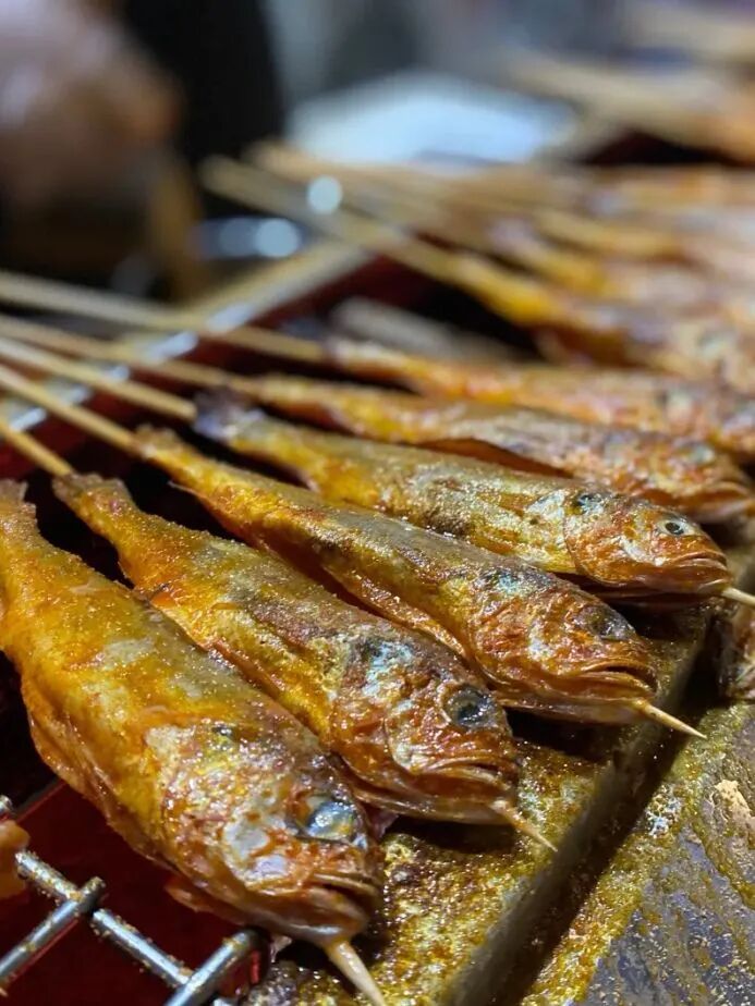 挤进角落的小桌,二话不说先点十串招牌小黄鱼。鱼身提前腌制入味,铺满孜然辣椒,往炭火上一搁,滋滋冒油,渐渐蜷成金黄的弧度。趁热入口,“咔嚓”一声,焦脆外皮应声裂开,蒜瓣似的雪白鱼肉裹着椒盐香,瞬间在舌尖炸开——鲜、辣、烫,一口上头!不能吃辣的朋友,建议先备好饮料,不然真扛不住这份霸道。
