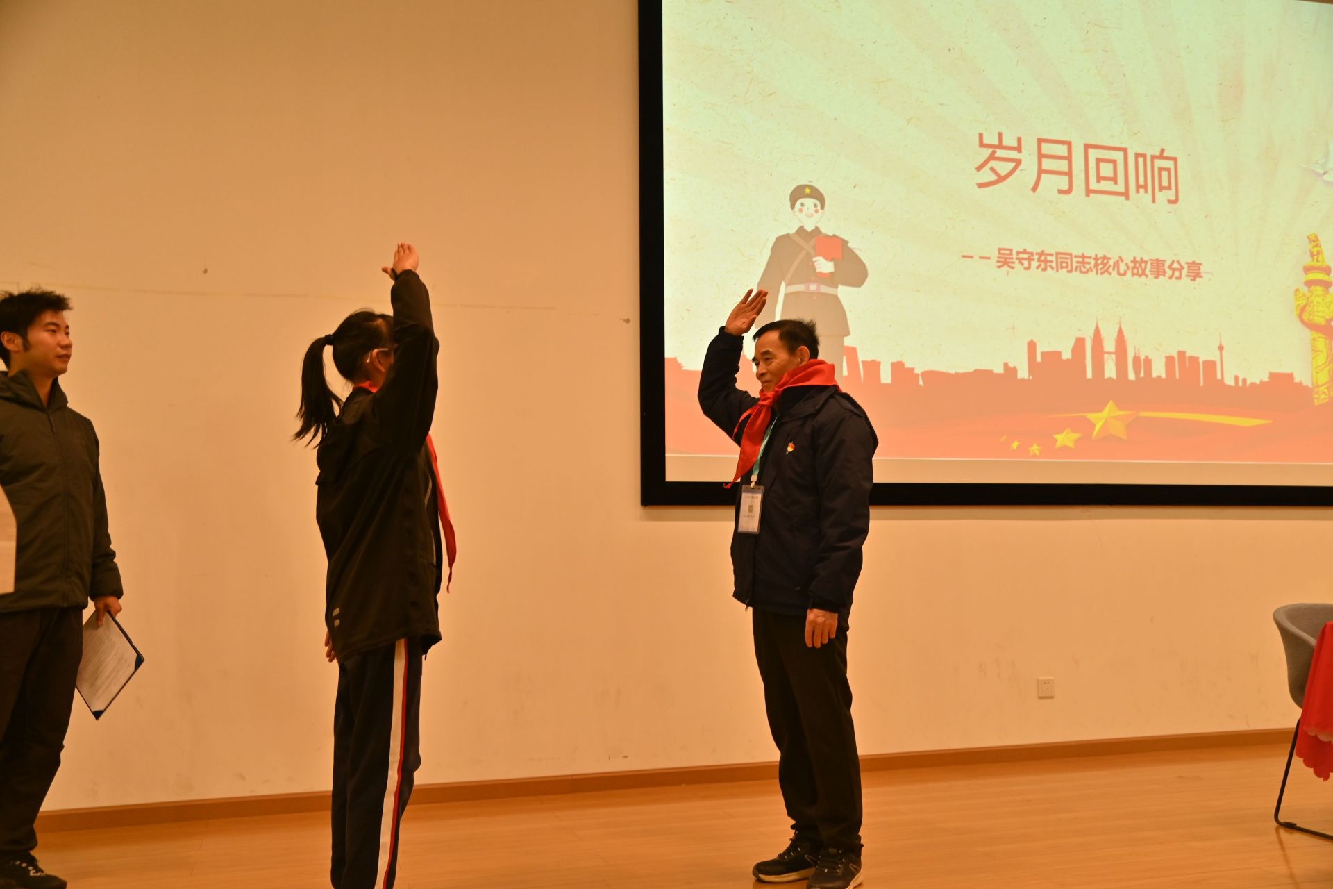 “崇高敬礼”环节中,少先队员代表为社区“五老”代表佩戴红领巾,团员代表献上鲜花,充分展现了青少年的崇敬之情。随后的“岁月回响”分享环节,“五老”以自身经历为蓝本,生动讲述红色故事,回忆战斗英雄舍身保护战友的峥嵘岁月,还分享了自己在车间苦学技术、超额完成生产任务,以及带领团支部成员勇担责任、无私奉献的奋斗历程。质朴的语言、真挚的情感,让在场师生沉浸式感受老一辈的坚守与担当,也让“五老”成为红色基因的“活载体”,彰显出社区关工委依托“五老”开展青少年思想教育的独特优势。
