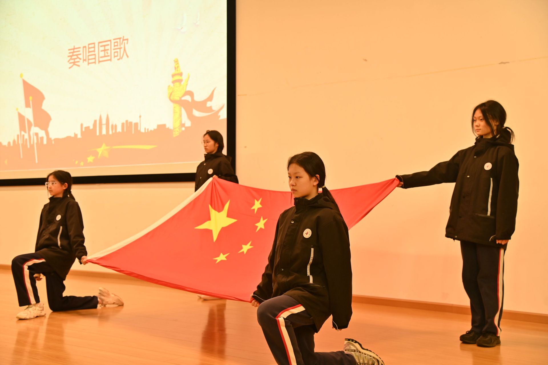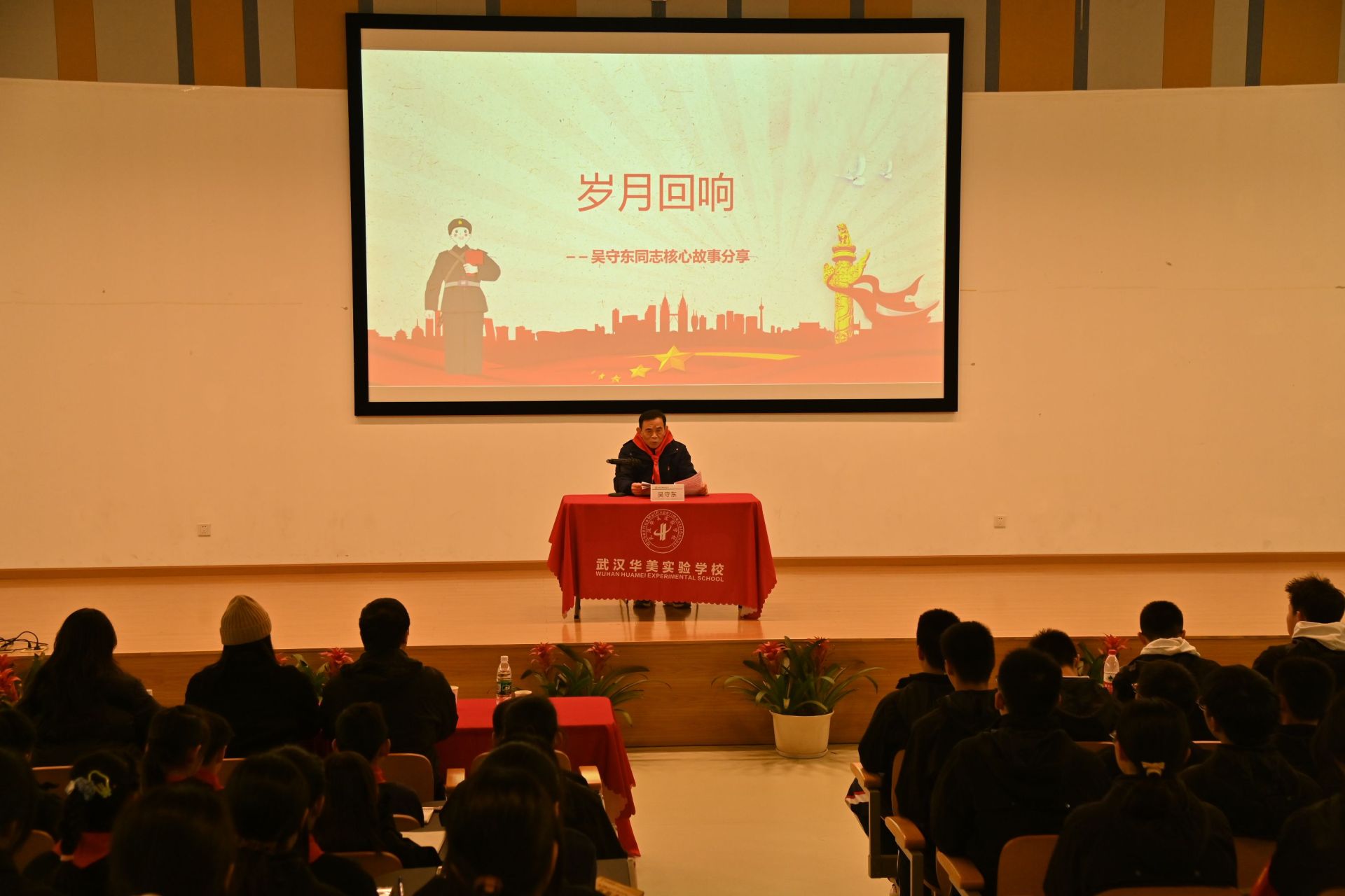 活动现场,武汉华美实验学校团委书记介绍活动主题,国旗班成员整齐列队展示,全场人员起立行注目礼,拉开活动帷幕。活动特邀社区“五老”代表吴守东,曾多次荣获优秀共产党员称号,是连续十年获评先进生产者的老模范。