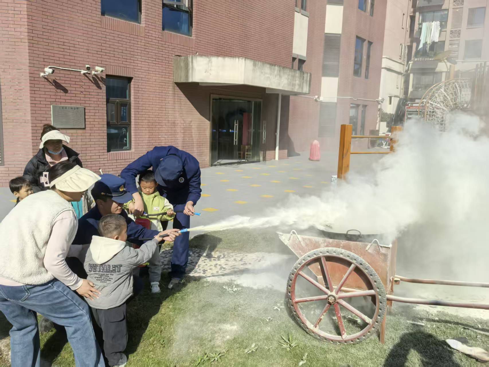 科普环节,消防员叔叔结合幼儿的认知特点,用通俗易懂的语言讲解了不同消防救援服的功能与用途,邀请孩子们试穿体验。此外消防员还详细演示了灭火器的正确使用方法,强调“提、拔、握、压”四步口诀,并针对不同火灾场景说明灭火器的选择技巧。
