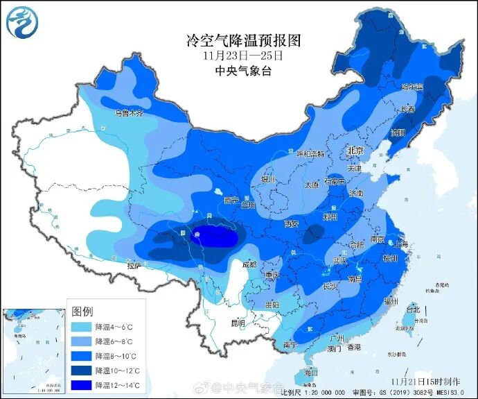 11月25日:晴天到多云,偏北风转偏南风2到3级,最高气温14~15℃,最低气温北部-1~1℃、其他地区2~4℃