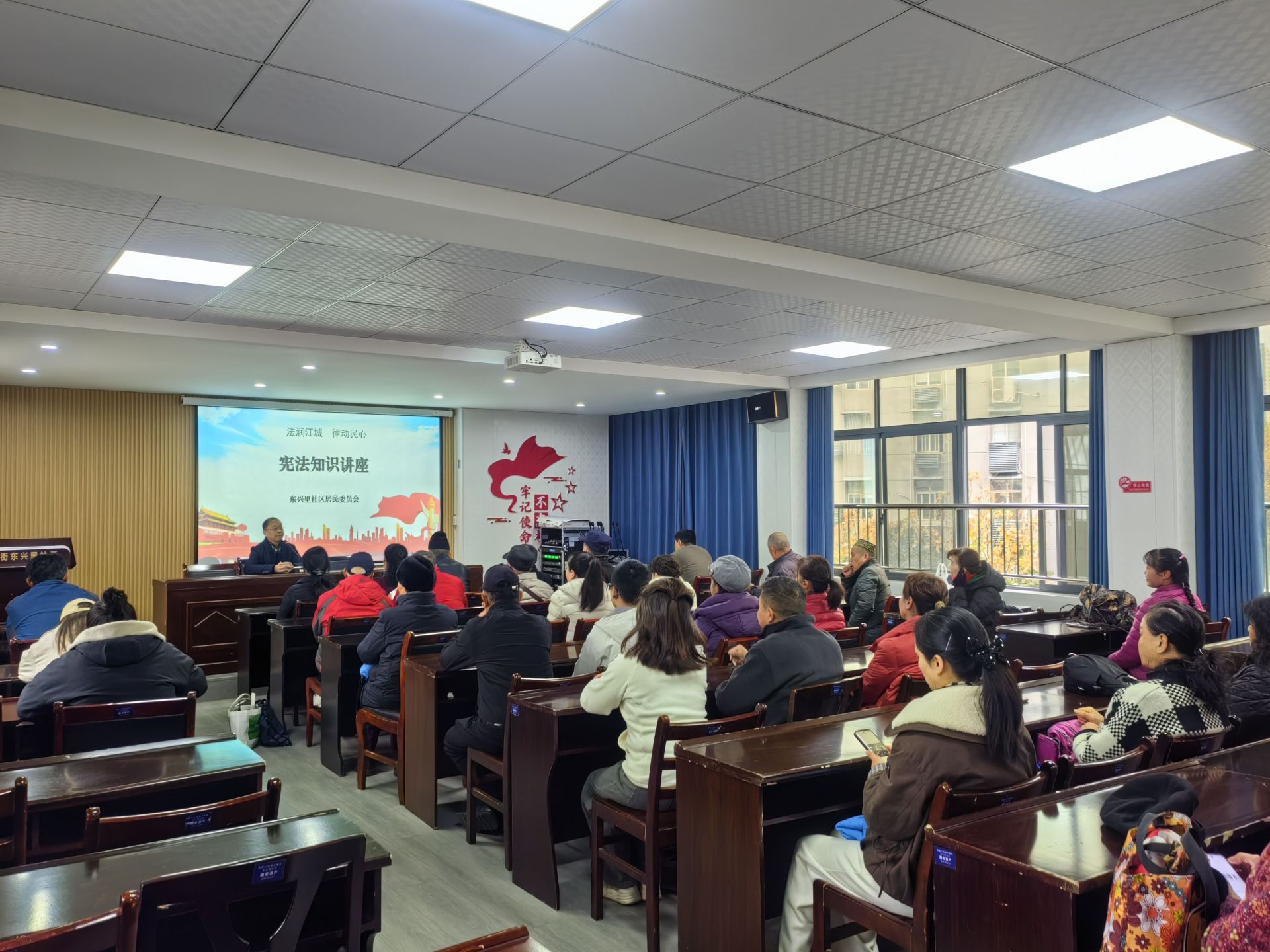 在第十二个国家宪法日来临之际,为深入弘扬宪法精神,让法治理念走进基层、浸润民心,2025年12月4日早上,东兴里社区特邀社区律师开展“法润江城,律动民心”宪法知识专题讲座,辖区党员代表、老年居民、商户代表等数十人踊跃参与。