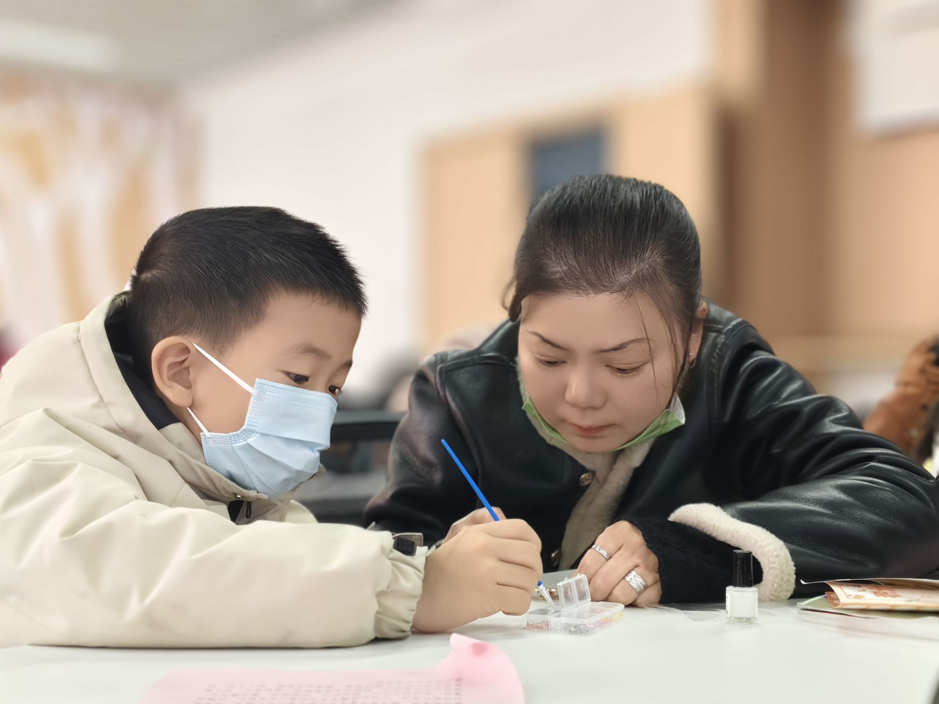 螺钿文化微课堂上,通过鲜活的PPT展示和“螺钿奥秘大闯关”知识问答,系统讲解螺钿工艺的悠久历史、独特制作特点及深厚艺术价值,让亲子家庭领略非遗文化魅力。讲解过程中巧妙融入“工匠精神”解读,引导家长与孩子深入思考工匠精神与良好家风中“专注”“坚持”品质的内在联系。亲子螺钿DIY环节亮点十足,老师现场分步演示选图、取片、上胶、粘贴、调整等制作流程,耐心强调安全操作注意事项与手工技巧,亲子携手协作、静心创作,在亲手打造专属螺钿作品的过程中,沉浸式感受非遗工艺的细腻匠心,也在协作互动中拉近亲子距离,让非遗传承更具温度与活力。