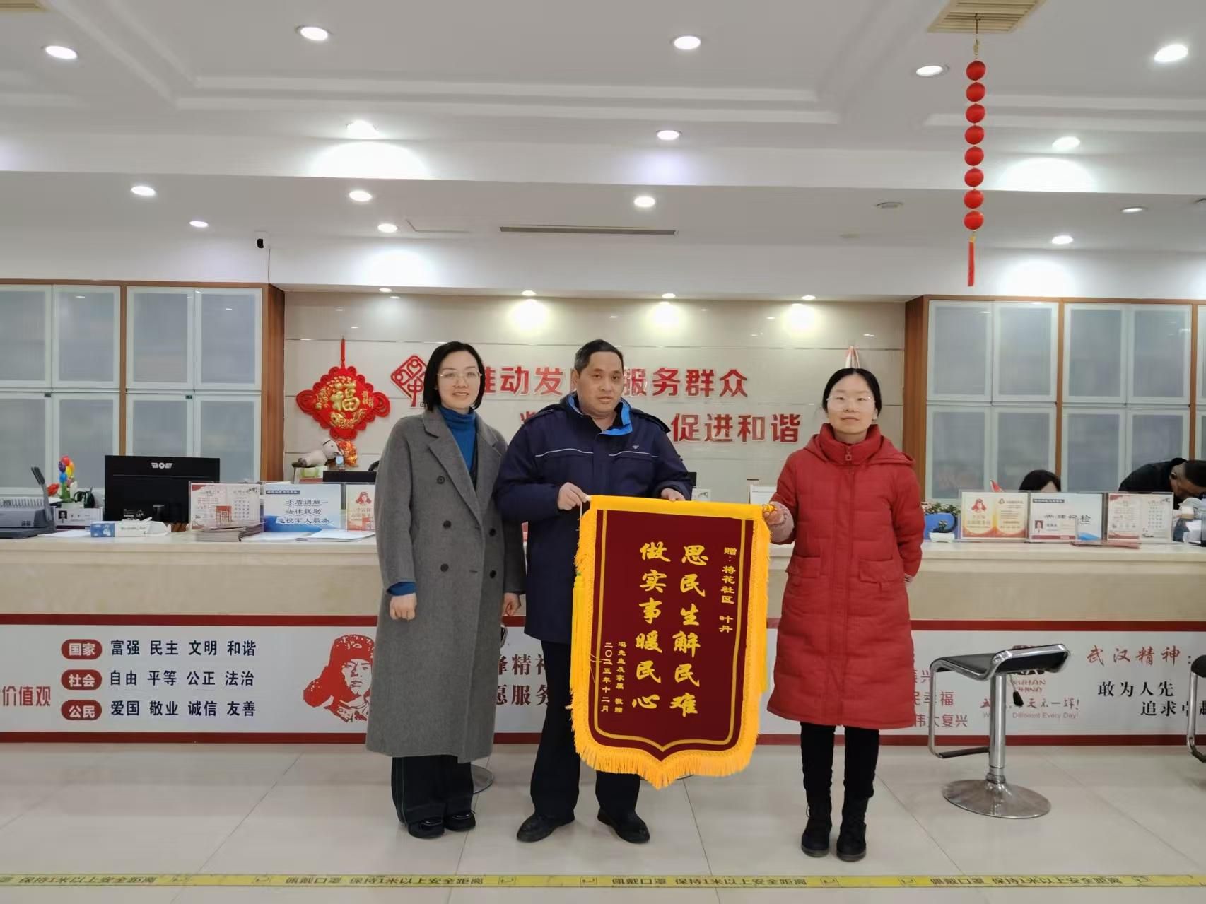 一面锦旗,一份认可;一声感谢,一份担当。12月11日,将军路街将花社区居民冯先生怀着满心感激,将印着“思民生解民难 做实事暖民心”暖心话语的锦旗送到社区党群服务中心,以此感谢工作人员在协助其办理救助过程中给予的贴心帮扶与高效服务,让困难群众切实感受到基层治理的温度与力量。