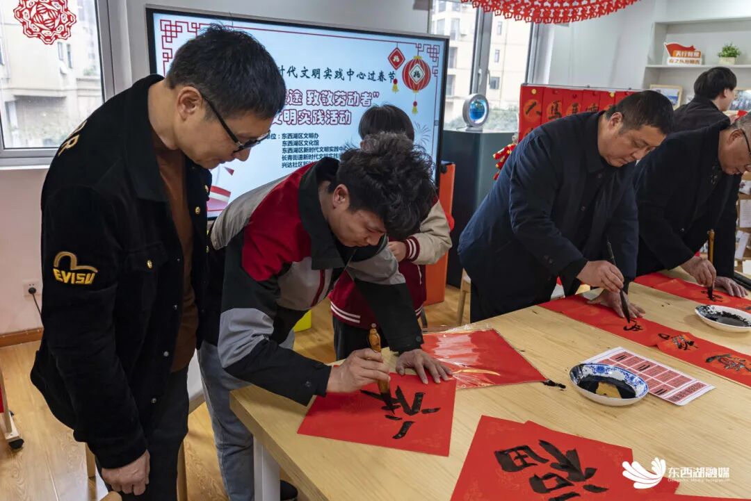 新春将至,为弘扬中华优秀传统文化,致敬一线劳动者,1月16日,东西湖区新时代文明实践中心联合区文化馆、长青街道新时代文明实践所、站,共同举办“墨香暖途 致敬劳动者”文明实践活动,为忙碌在一线的快递、物流从业人员送上真挚的关怀与祝福。