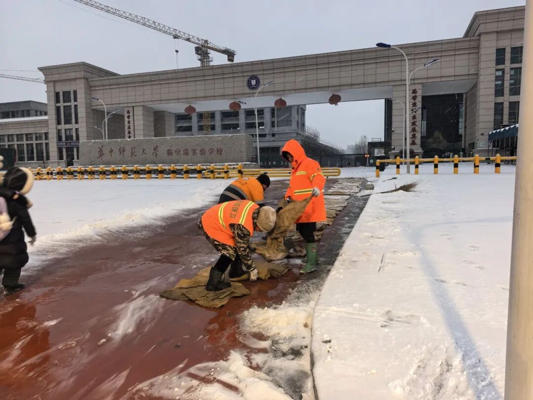学校周边是此轮除雪的重点。20日早晨7点,在华中师范大学临空港实验学校门口,径河街环卫工人和执法中心的队员们,正弯着腰铲雪。“径河街环卫队长黄彬一边铲雪一边介绍,先用雪铲清理金北一路主路上的积雪,再转战至机械进不去的人行道,全靠人工一锹一锹清理。