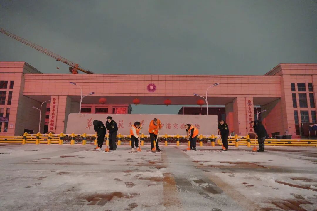 工作人员在学校门口铲雪。