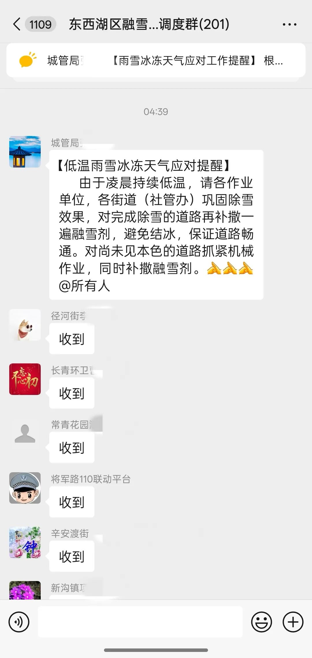 1月20日凌晨4点15分,东西湖区融雪防冻指挥调度群里消息不断跳动。