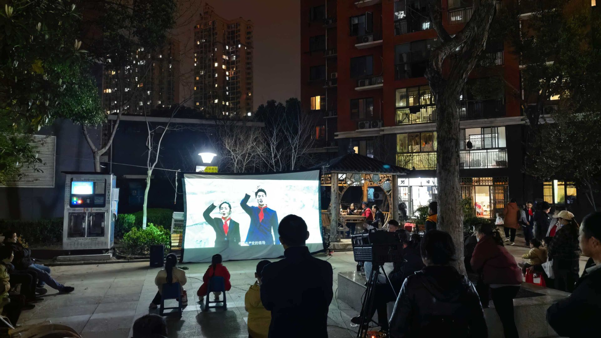 傍晚时分,工作人员提前抵达现场,有条不紊地搭建银幕、调试放映设备、摆放座椅,做好各项筹备工作。随着夜幕降临,居民们陆续携老带幼来到广场,有的搬来小板凳围坐前排,有的三五成群轻声交谈,现场氛围热闹而温馨,充满了邻里间的烟火气。