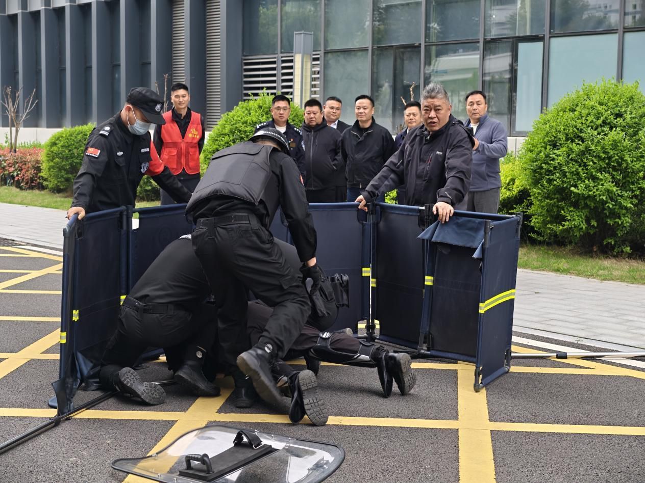 上午9时许,演练正式启动。演练模拟医院门诊区域突发疑似持械滋事事件,现场安保人员第一时间触发警报,迅速启动应急处置预案。医院安保队伍立即手持防暴盾、钢叉等器械,对滋事人员进行先期围堵控制;社区工作人员快速响应,有序引导就诊群众疏散撤离,安抚群众情绪,维护周边秩序;派出所民警接到警报后迅速抵达现场,规范使用防暴装备,快速制服“滋事人员”,全程动作规范、衔接顺畅,顺利完成应急处置全流程演练。