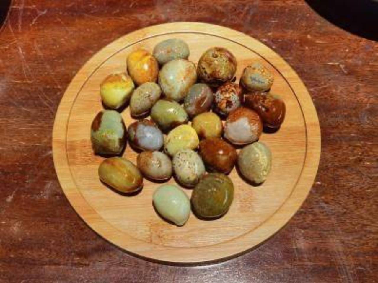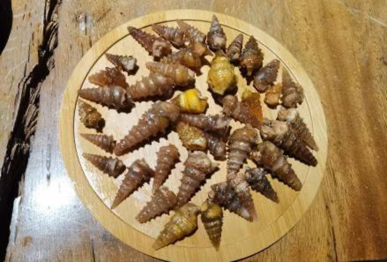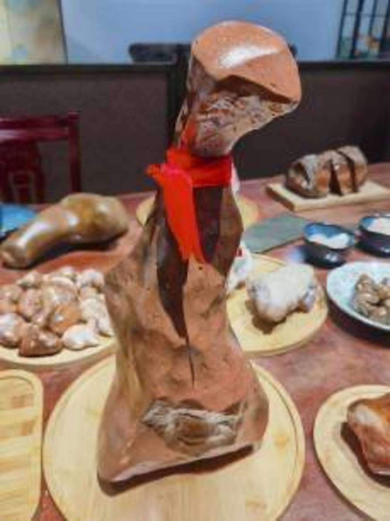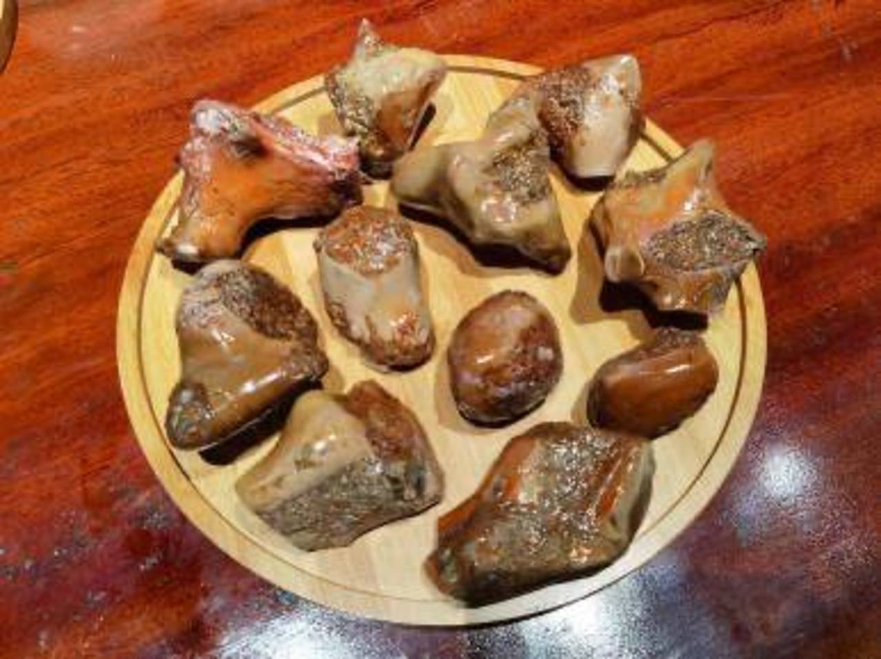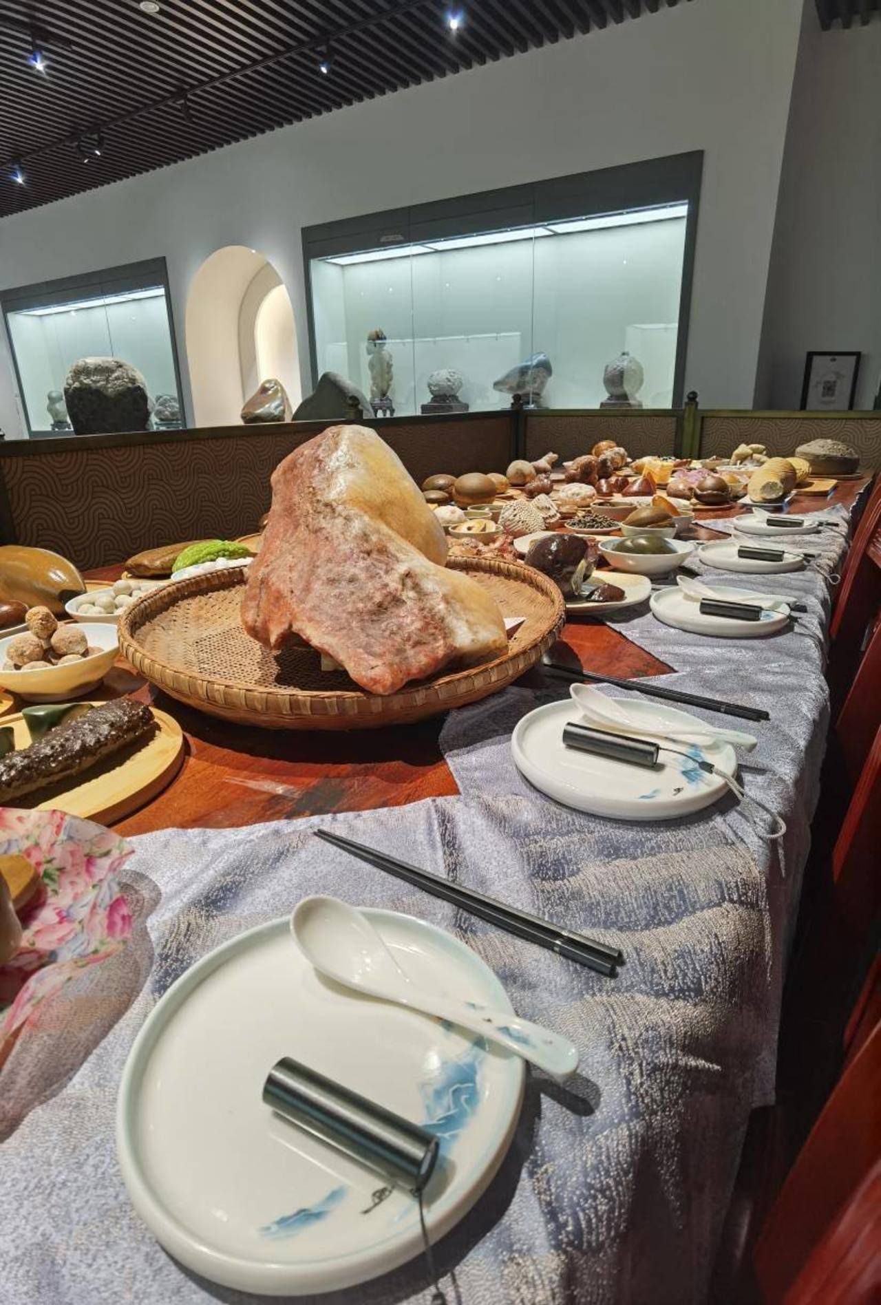 这些菜肴不仅有热菜,还有海鲜、蔬菜、干果、水果,个个形神兼备。那亿万年前的古生物化石形成的“大鲍鱼”“巨无霸汉堡”,戈壁滩上艰难形成的玛瑙原石“雪花鸡腿”、亿万年前海底化石形成的“爆炒田螺”等等,尤其是一块块“五花肉”石头的纹理,更是惟妙惟肖,令人叫绝。
