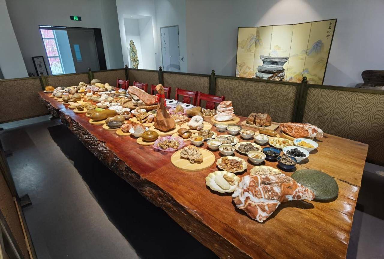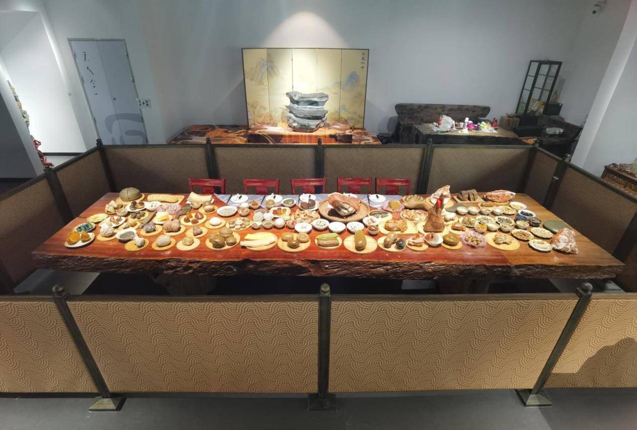 武汉天人合一奇石博物馆从多年收藏中选出了这一百零八道菜肴,但与普通菜肴不同的是,这些菜不仅能看,在吃法上也是别具一格的,因为它们是上千块天然奇石所烹饪的。