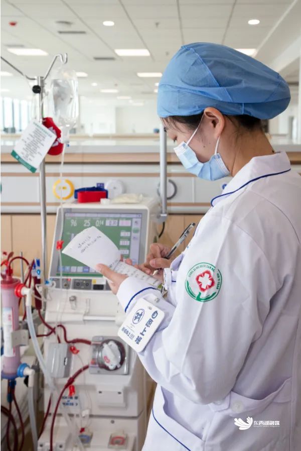 “一般情况下,患者每周需做2到3次透析,每次时长在4小时左右。在透析过程中,我们会通过巡查减轻患者的不安与焦虑。”伍彬介绍,血液净化科室偏暖色调营造安静舒适空间,在插座位置等硬装设计上,有不少方便病员的特别定制。“医护人员随叫随到,在医疗服务上做到全心全意。”