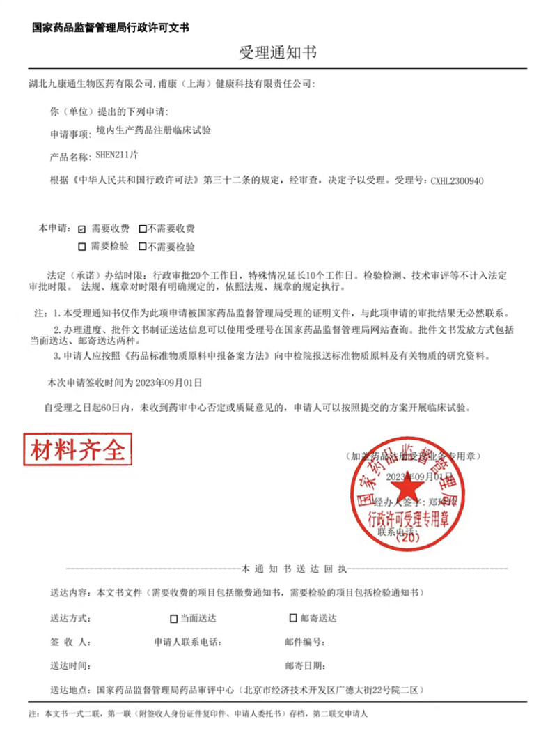 9月4日,湖北九康通生物医药有限公司研发的口服抗新型冠状病毒SHEN211片的临床试验注册申请获得国家药品监督管理局受理,这款新冠口服药是国内首款非拟肽类3CL蛋白酶抑制剂一类创新药物,单独使用,一天服用一次,安全性较高,病毒抑制性远优于Paxlovid(奈玛特韦片/利托那韦片),对SARS、MERS3、NL63等冠状病毒也有抑制效果。这一新药有望实现了湖北口服抗新型冠状病毒一类创新药物“零突破”。