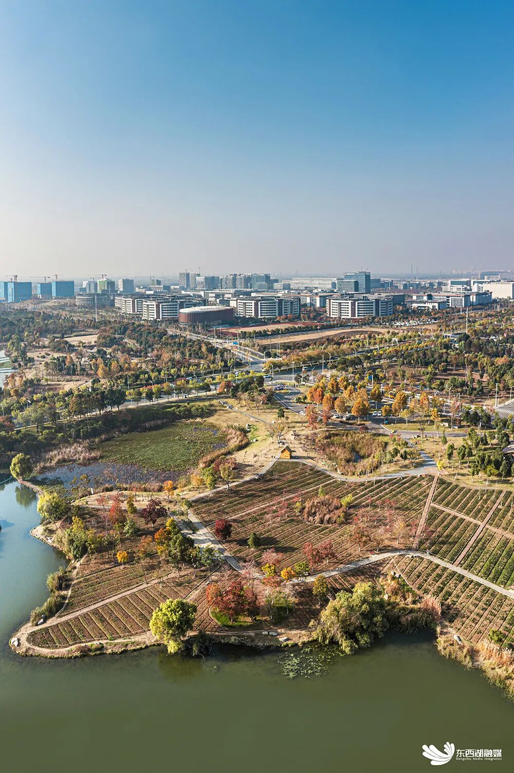 还有码头潭文化遗址公园、中央明渠樱花溪公园和径河公园三大生态绿心环抱。通过引绿入城,并将河流、湖泊以及湿地连通,一基地、一新城形成了蓝绿交织的生态网络空间,实现了“一桨游遍、水系联通”的“湖泊自由”和“百米见绿,一里见园”的“公园自由”。