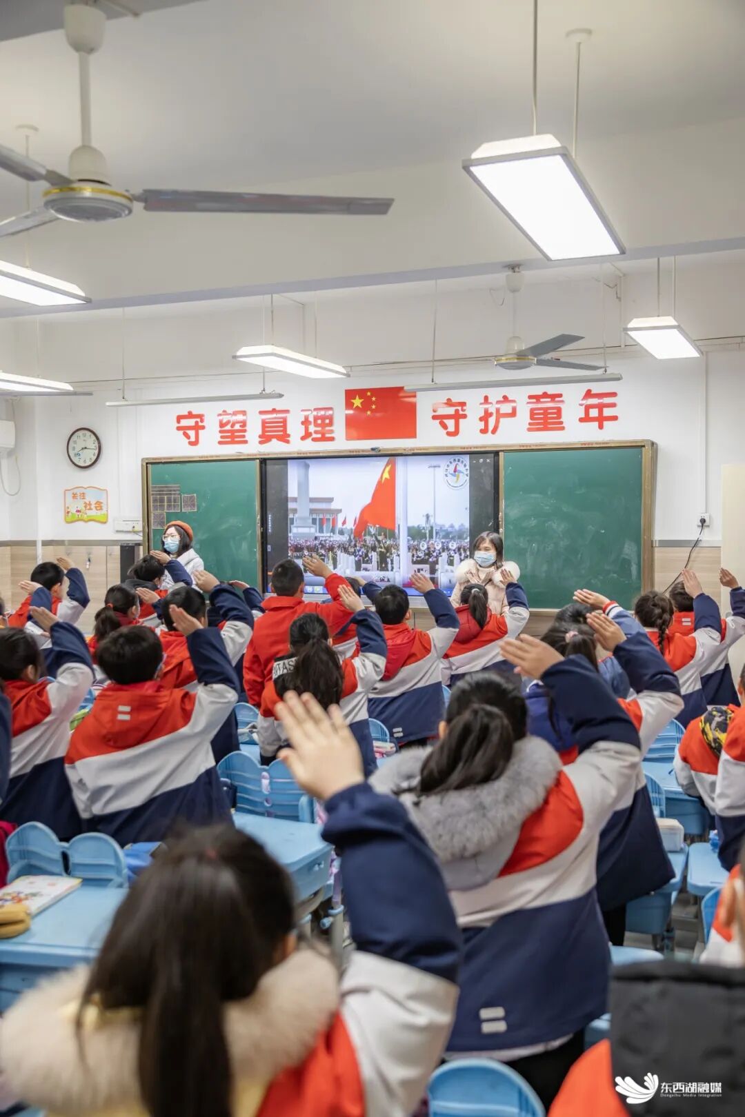 开学典礼在各班教室举行。同学们身着整齐的校服,佩戴鲜艳的红领巾,昂首挺胸,目光注视着视频中冉冉升起的国旗,以饱满的热情、洪亮的声音唱响国歌,展现出良好的仪态和精神风貌。