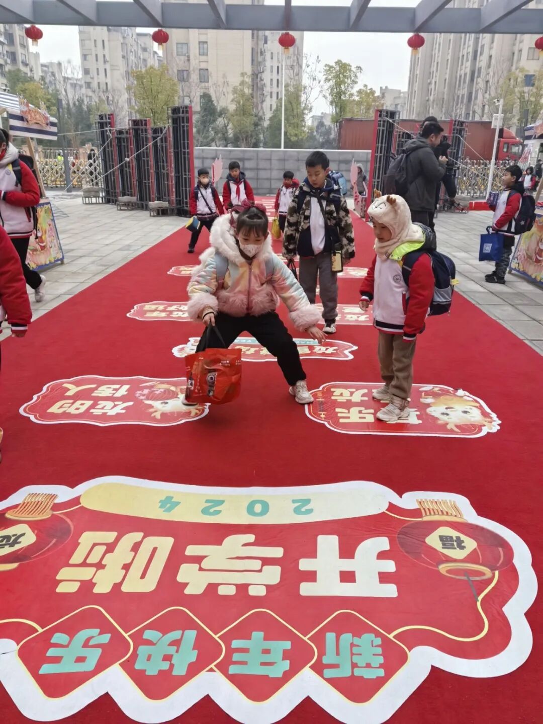 龙行龘龘,龙年大吉,龙马精神……校门旁,满是龙图像和喜庆标语的红色打卡墙,吸引了众多家长争相拍照合影。教室玻璃和门上,到处张贴着龙元素的窗纸和鲜红的灯笼,浓浓的国风迎面扑来。