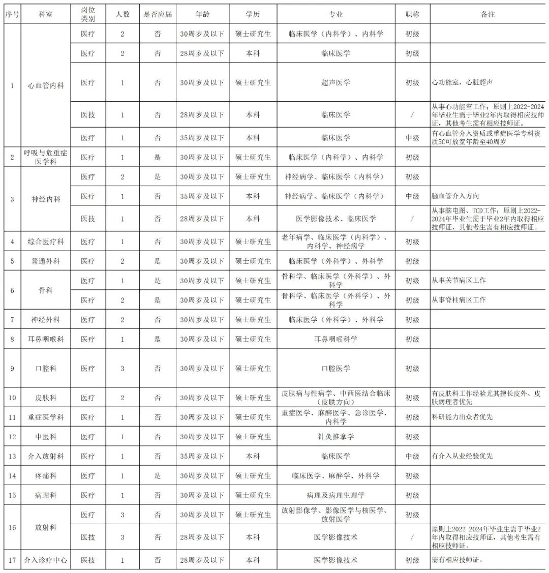1.学历要求:起点学历要求为全日制统招本科(不含“中起本”“专升本”“专套本”),应届毕业生应在2024年7月31日前取得各阶段的学历和学位证书,往届毕业生须在资格审核时已取得各阶段的学历和学位证书,其中应届毕业生指2024年当年毕业应届毕业生;医师(医疗岗位)需具备执业医师证和规培证,原则上具有中级职称证不作规培要求,应届毕业生应于2024年7月31日前取得相应专业规培证,若遇上级延迟考试时间,则应于相应时间内取得,规培方向与岗位要求一致,具体要求详见各招聘岗位;技师应取得相应岗位的技师证,原则上2022—2024年毕业生需于毕业2年内取得相应技师证,其他考生需有相应技师证,如果上级报考政策调整,则应于相应时间内取得。具体要求详见各招聘岗位。