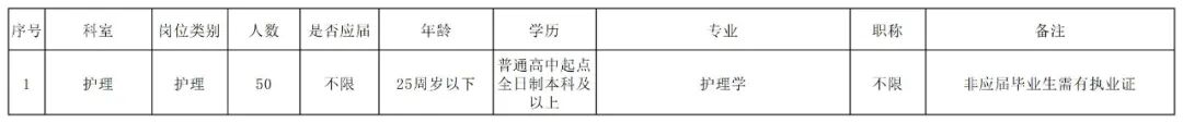 2.年龄要求:普通高中起点全日制本科毕业生25周岁以下,护理专业研究生30周岁以下。往届生须持有护士执业证书,并提供三级及以上医院半年以上工作经历证明。应届生若被录用,须在2025年内取得执业证书或成绩合格单,否则将被取消录用资格,解除劳动合同。
