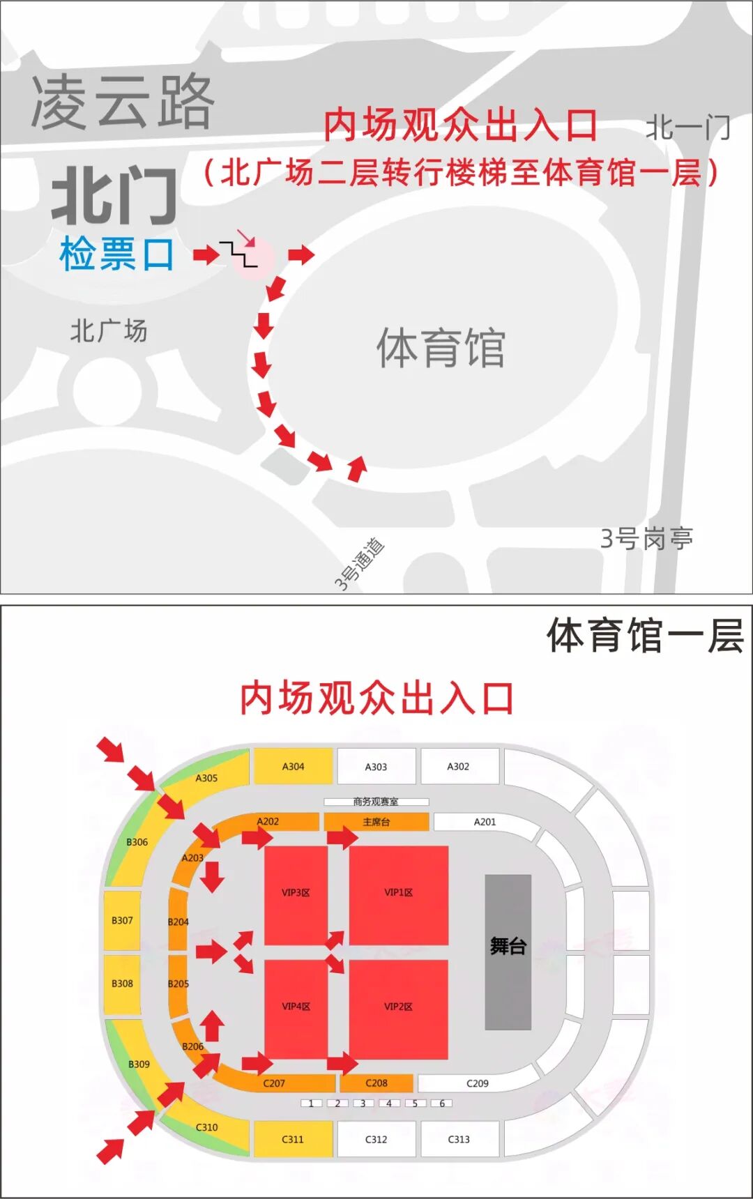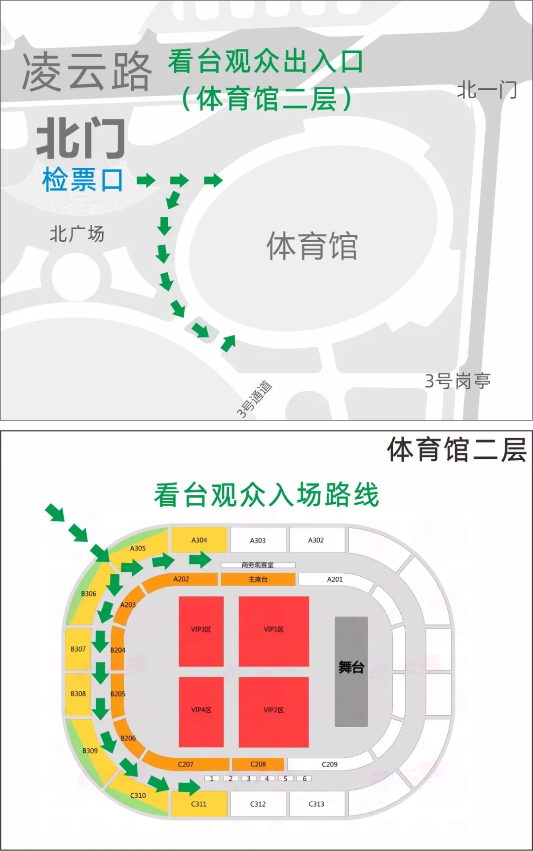 观众路线:看台观众、内场观众统一从凌云路北广场检票口入场