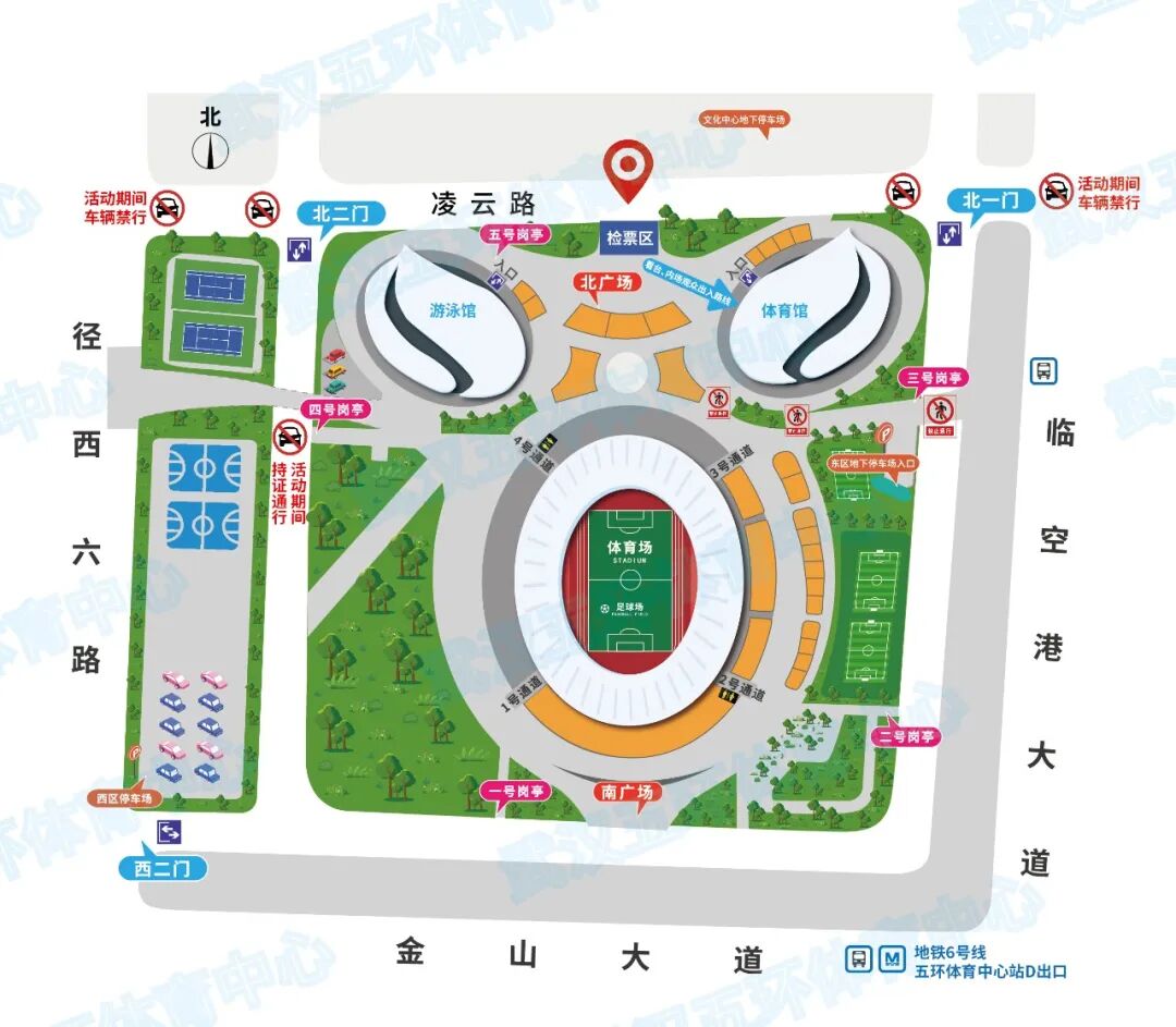 1、乘坐地铁(1)6号线至五环体育中心站,从D出口前往武汉五环体育中心(2)1号线码头潭公园站转乘6号线至五环体育中心站