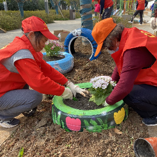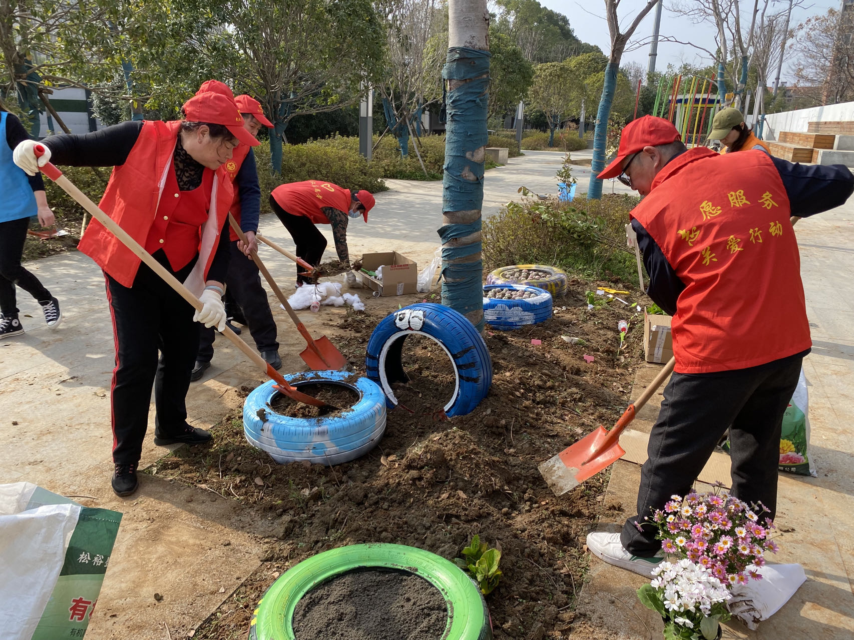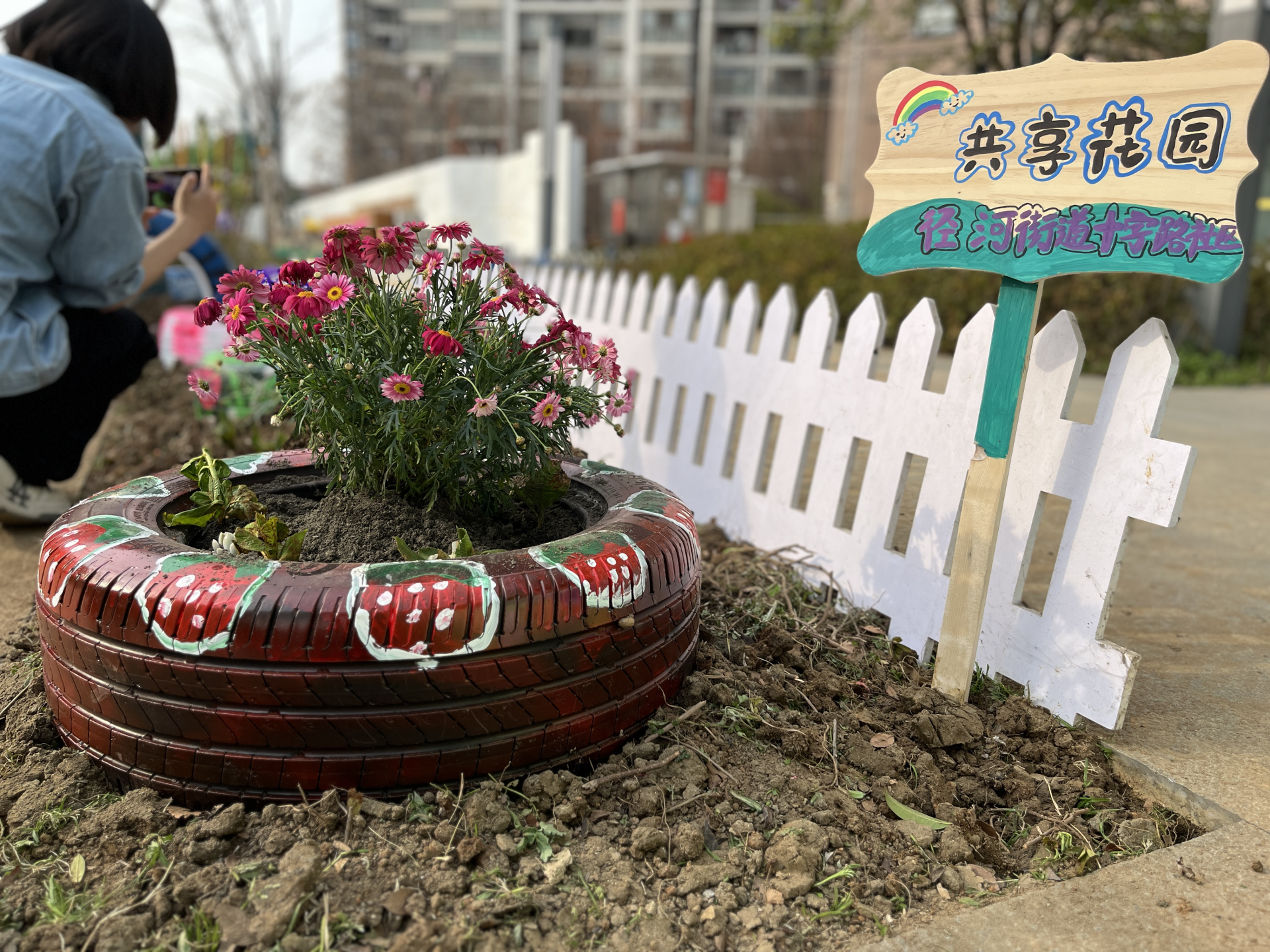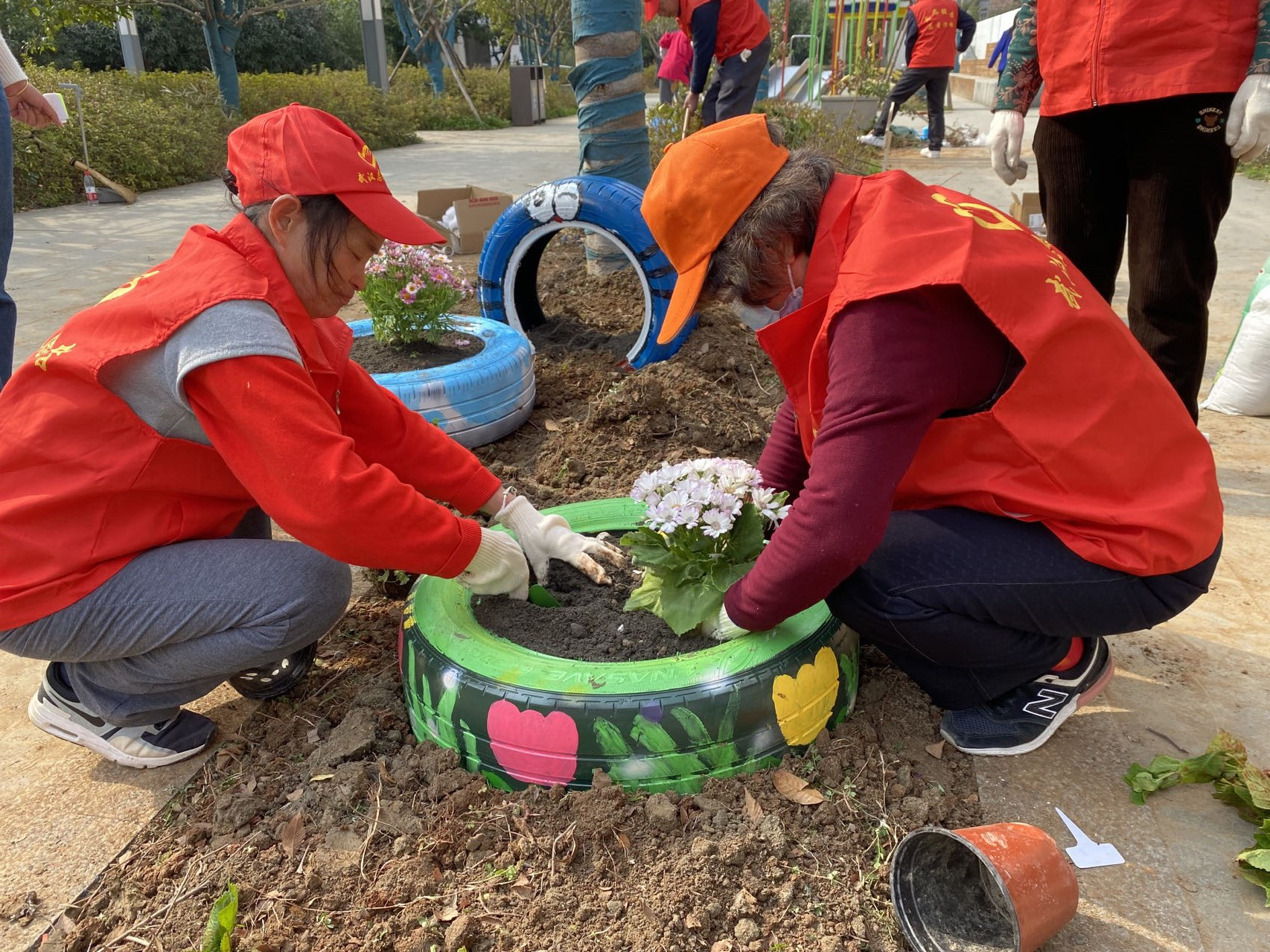 活动现场设有居民打卡区、创意彩绘区、新景创意区和植树区等4个区域。学生和志愿者在绘画教师指导下,分组进行“轮胎旧貌换新颜”创作,将废旧轮胎“变”成色彩缤纷的艺术品。在植树区,大家挥动锹铲移土、稳固树苗填补土坑、培土并灌溉,分工合作栽植树苗。