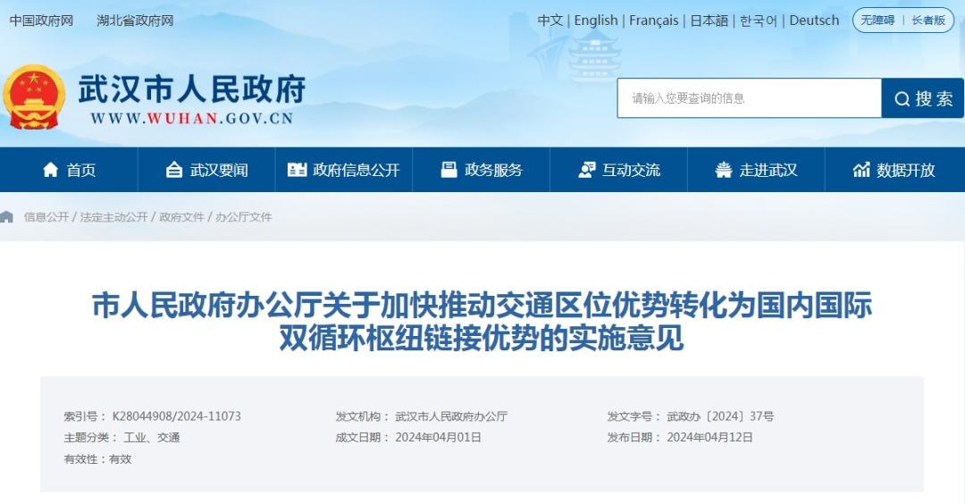 近日,武汉市人民政府网发布《市人民政府办公厅关于加快推动交通区位优势转化为国内国际双循环枢纽链接优势的实施意见》具体内容如下: