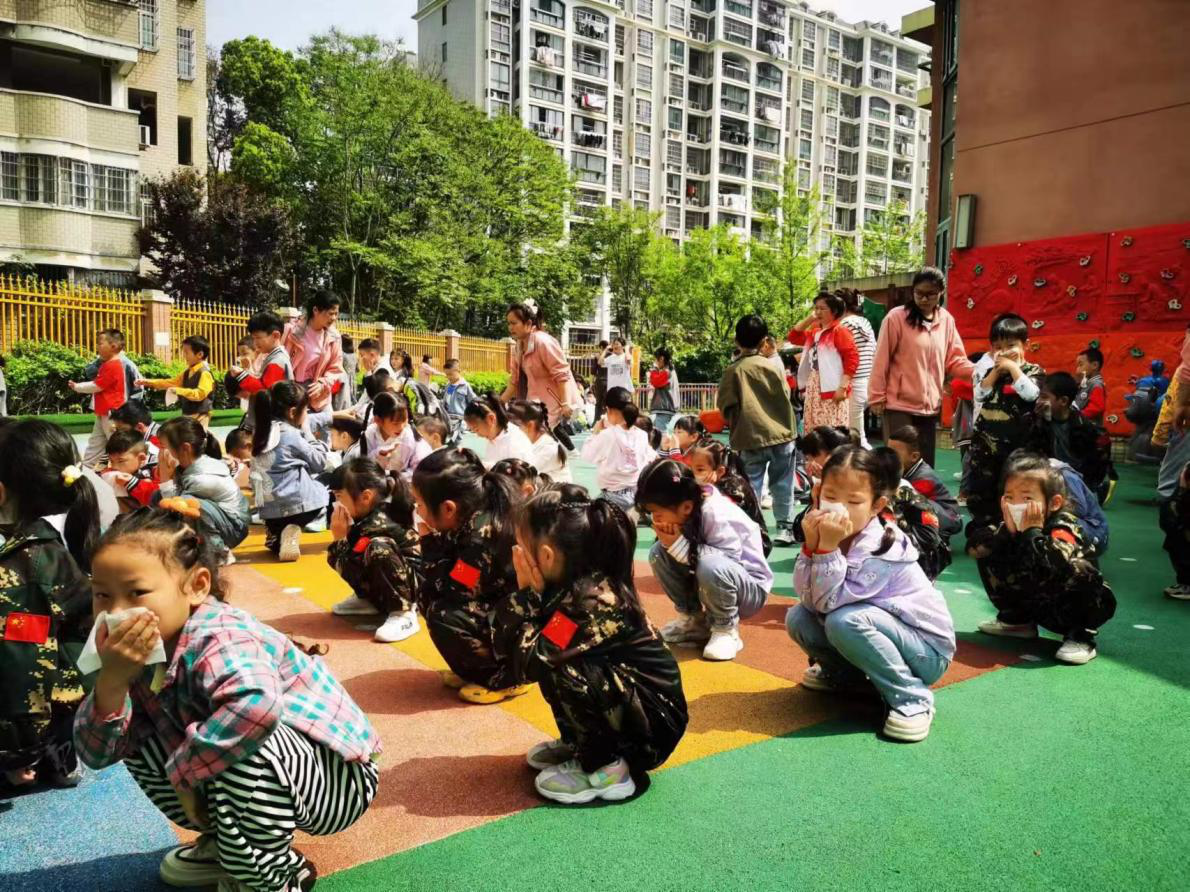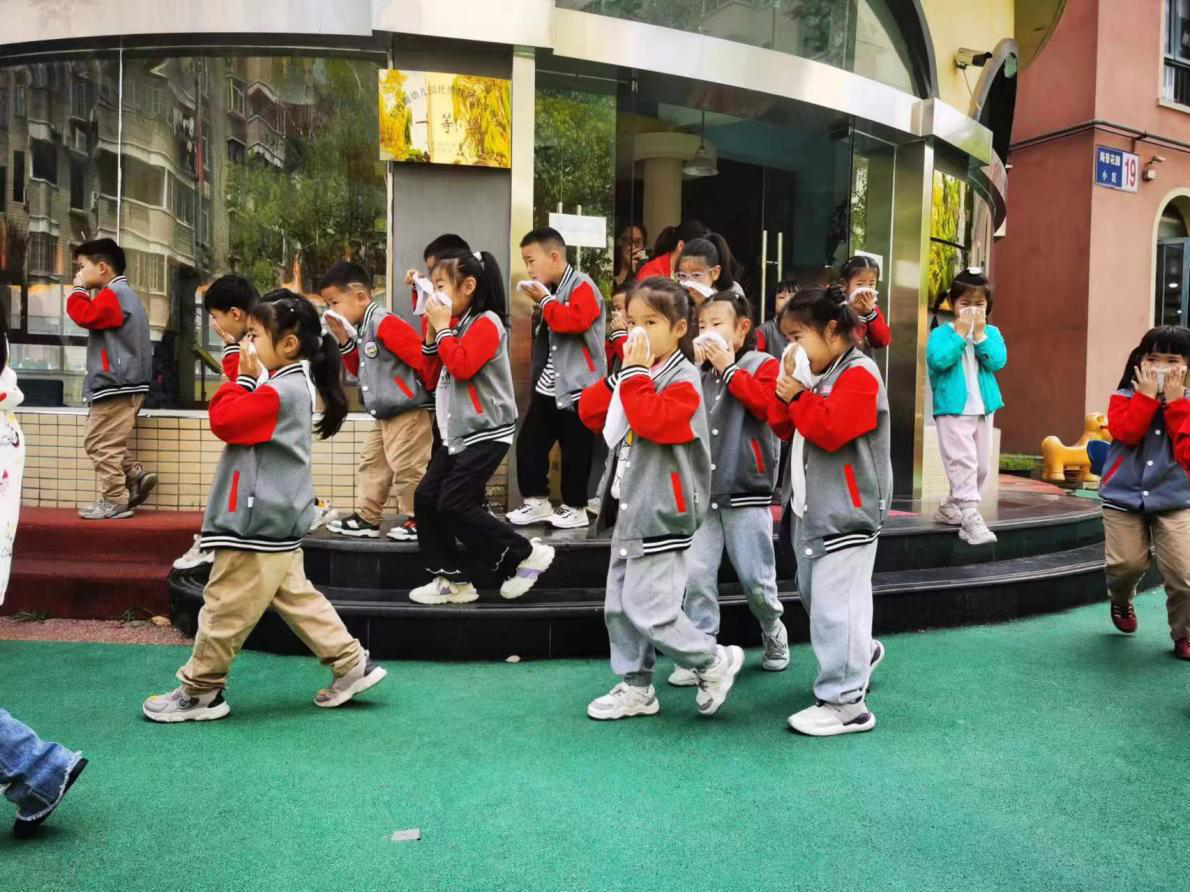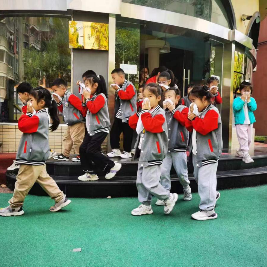 随着急促的消防警报声响起,幼儿园各班老师们快速反应,按照拟定的逃生方案,有条不紊地进行疏散逃生工作。在老师们的细心指挥下,小朋友们弯着腰,用湿手帕、湿毛巾等捂住口鼻,沿着指定的消防演习路线迅速向应急安全出口疏散,到达预定撤离点,整个疏散过程仅用时两分四十七秒。全体小朋友到达安全撤离点后,各班快速整队、核查清点人数并上报各班撤离的情况,整个演习过程顺利完成。