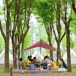 在野奢营地,17位来自硚口某艺术中心的老师们吃着烧烤、聊着天,团建玩得非常尽兴; 在自然造物区,参加研学的小学生们在导游指导下观察动植物、走进农田,做手工,亲近自然的同时增长知识; 在乐园活动区,孩子们在丛林间攀爬探险,快乐地运动,增强体魄……