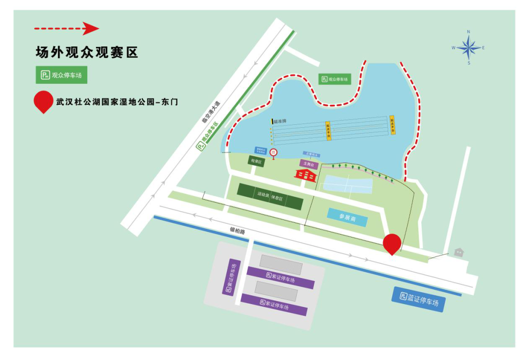 导航搜索“武汉杜公湖国家湿地公园-东入口湖北省武汉市东西湖区银柏路”,根据指引停放车辆后步行前往观众入口。