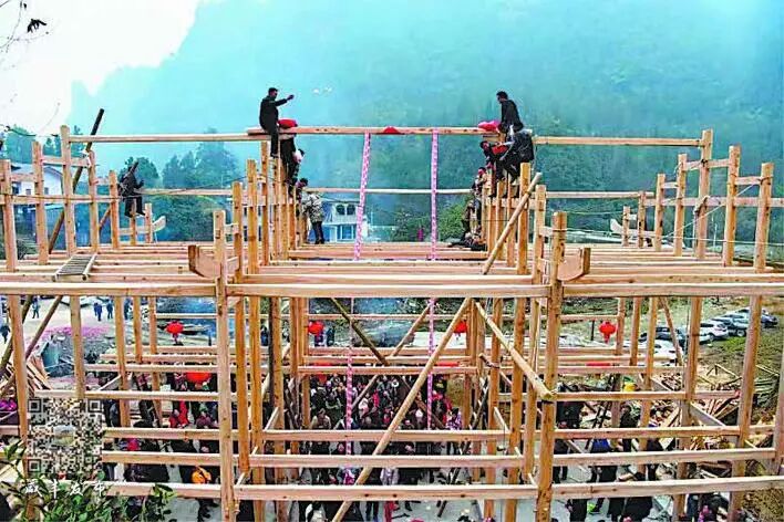 5月18日,湖南省龙山县兴隆街上,一栋五柱四骑的土家吊脚楼拔地而起。这是恩施宇君建设工程有限公司成立以来跨省承建的又一栋土家吊脚楼。同一时刻,咸丰县高乐山镇老里坝乡村公路边上,占地30亩的恩施宇君建设工程有限公司,机器轰鸣,一派忙碌。“需在本月内交付的吊脚楼木屋就有5栋,其中县内2栋,省外3栋。”该公司负责人、咸丰土家吊脚楼营造技艺县级代表性传承人蒋昌辉介绍,3年承建近100栋吊脚楼,年均产值超1000万元。宇君建设的异军突起,与咸丰县加大非遗保护、复兴“干栏式建筑之乡”的决策不无关系。