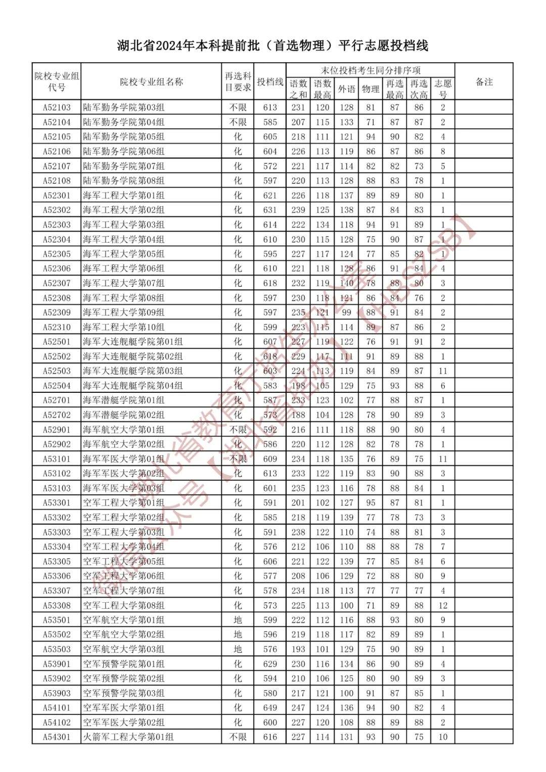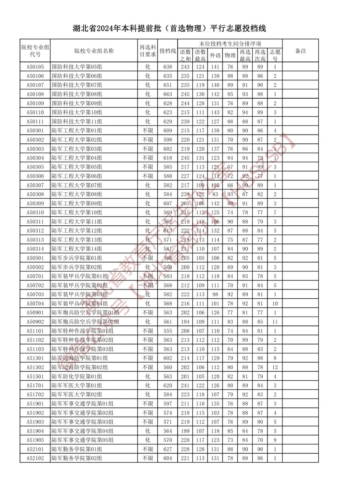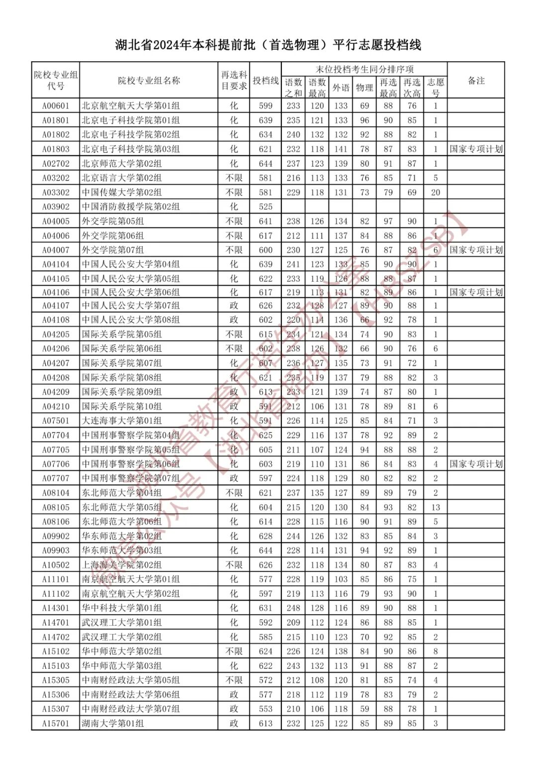 湖北省2024年本科提前批(首选物理)平行志愿投档线