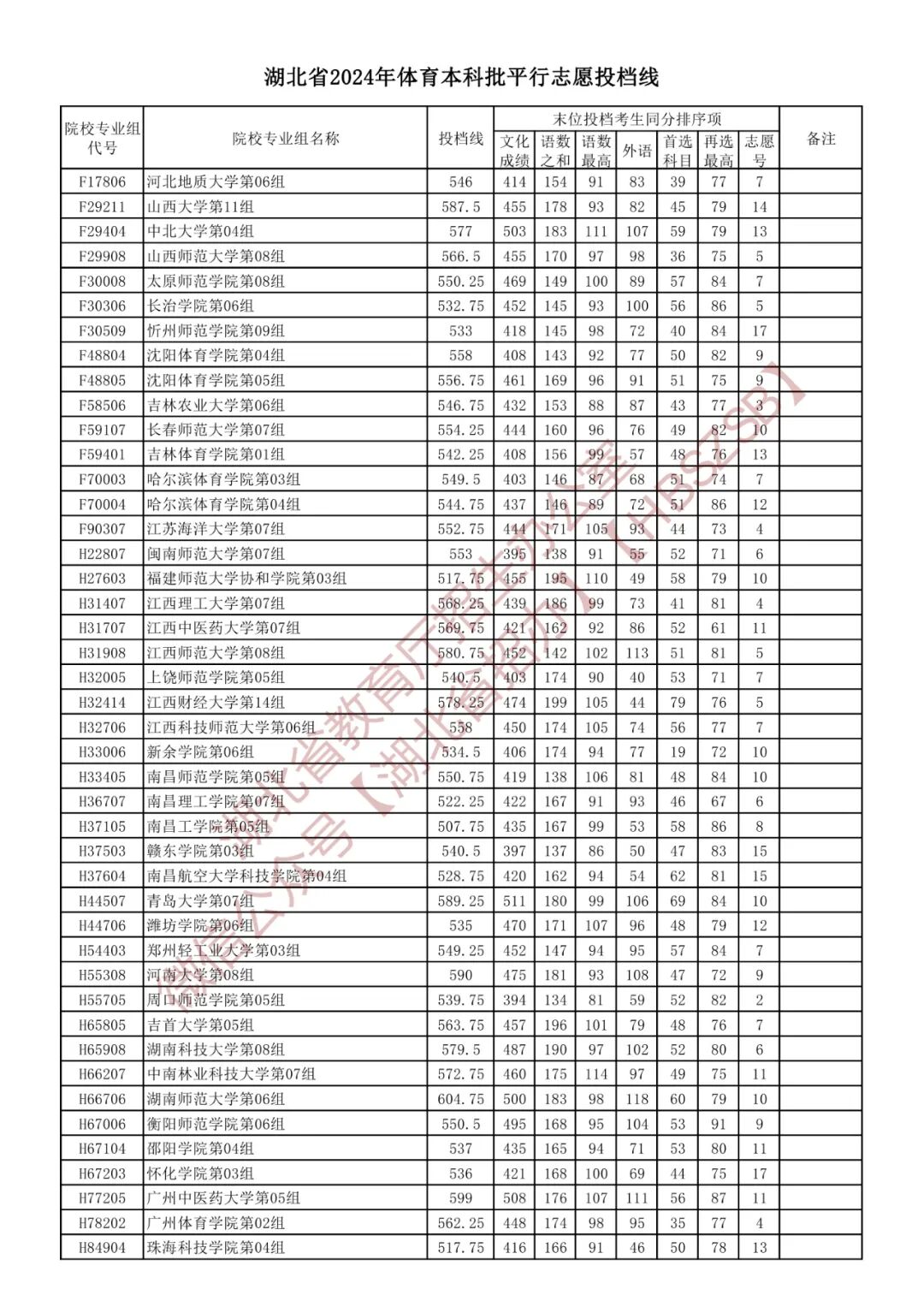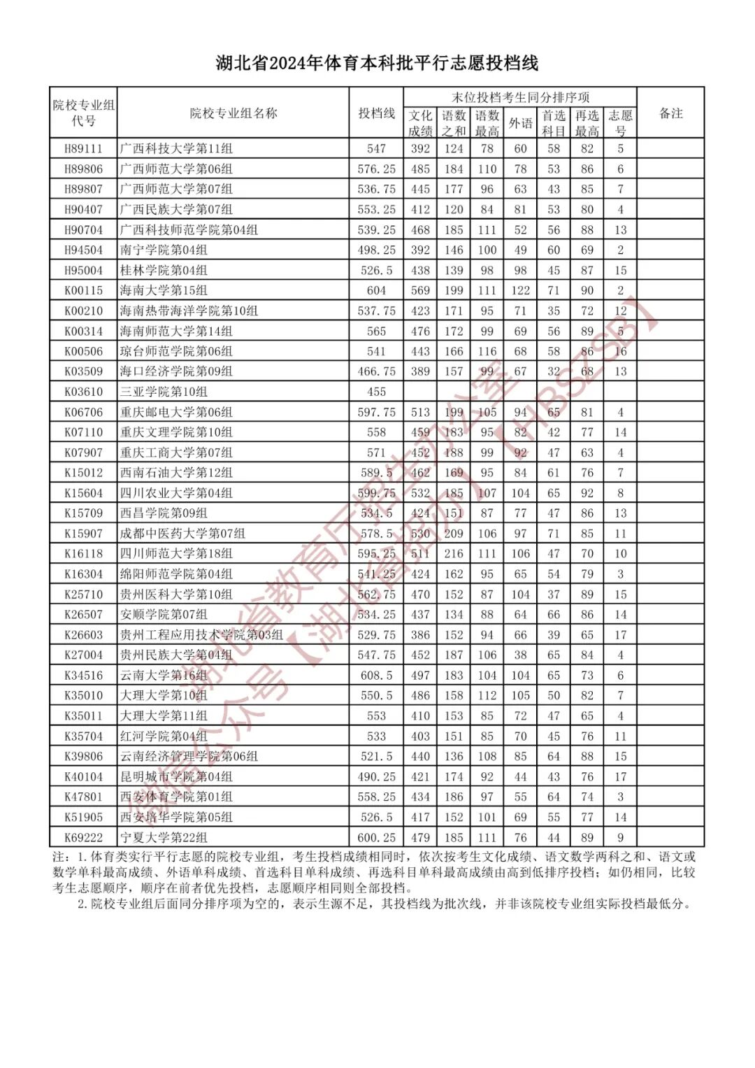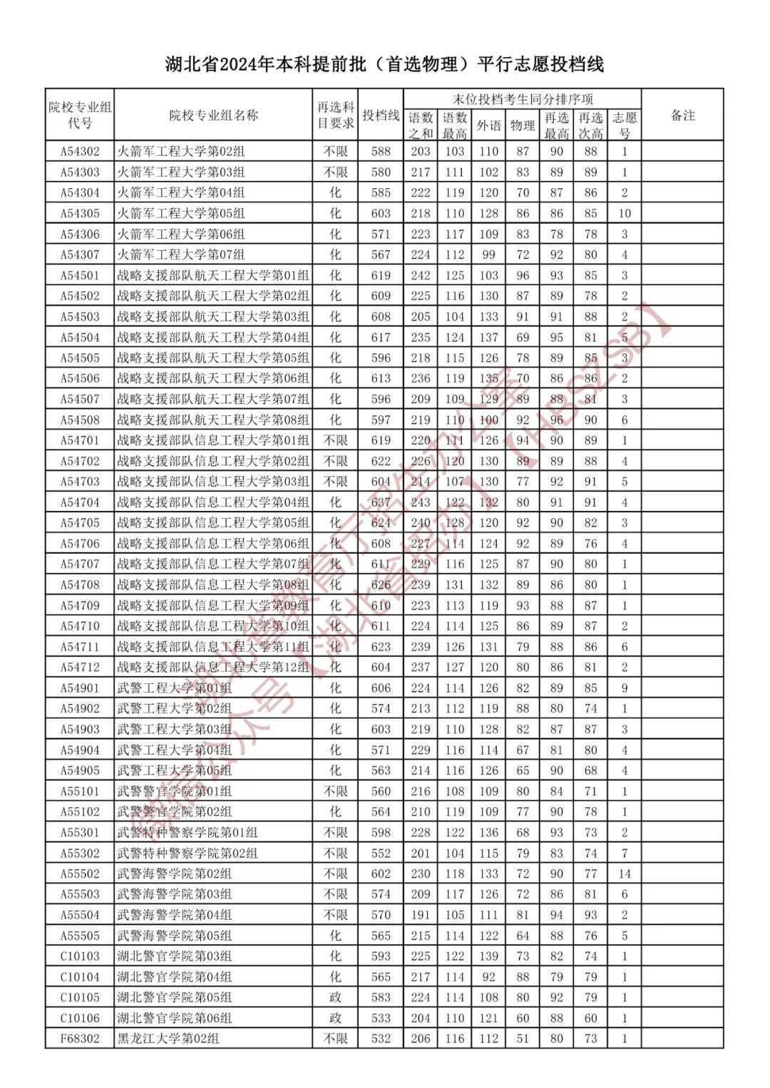 湖北省2024年本科提前批(首选物理)平行志愿投档线