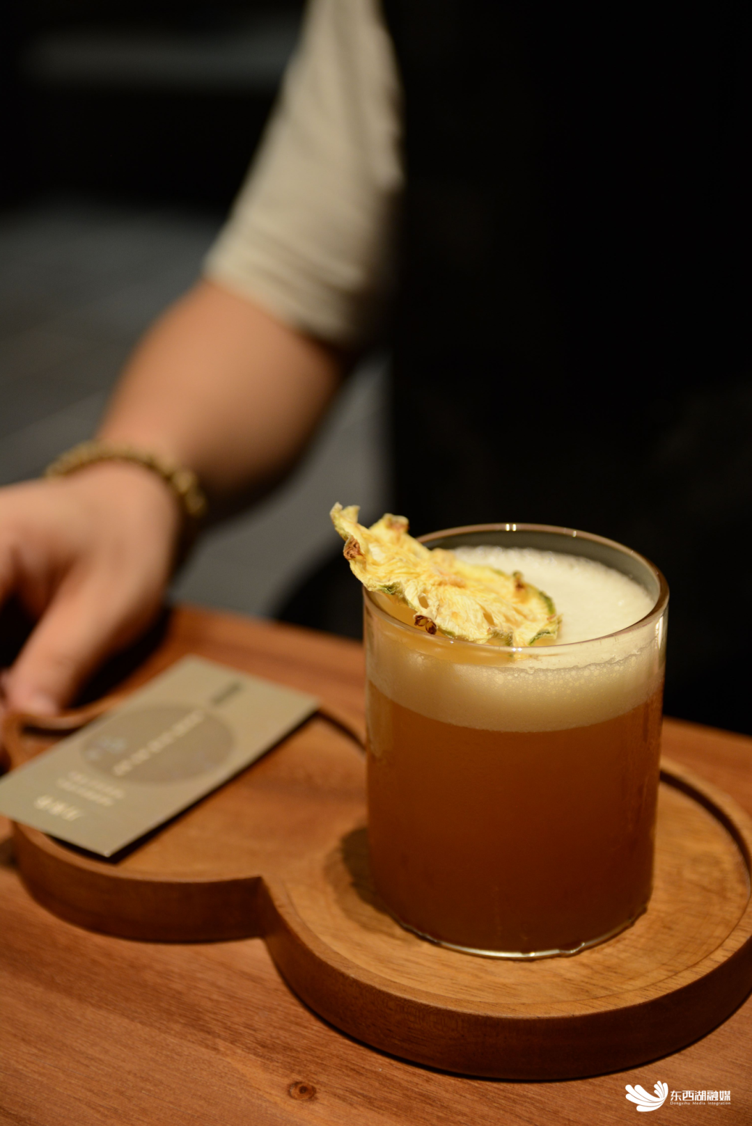 名为“月黄昏”的茶饮外观是淡黄色,上面放一片烘干了的凤梨片。据介绍,这款茶饮的名字取自诗句“暗香浮动月黄昏”,成分有凤梨、苹果、柚子花、桂花乌龙,正符合诗句里的“暗香”。