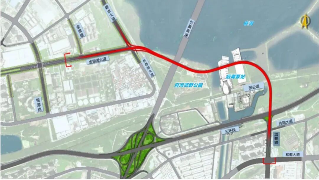 温馨路北延工程(碧水大道—和谐大道)西起金银潭大道与银潭路交叉口,东至温馨路与和谐大道交叉口,全长约3.3公里,其中桥梁长2.9公里,规划为城市主干道,双向6车道,设计时速60公里/小时,全线设置一对定向匝道衔接碧水大道,匝道总长约900米。