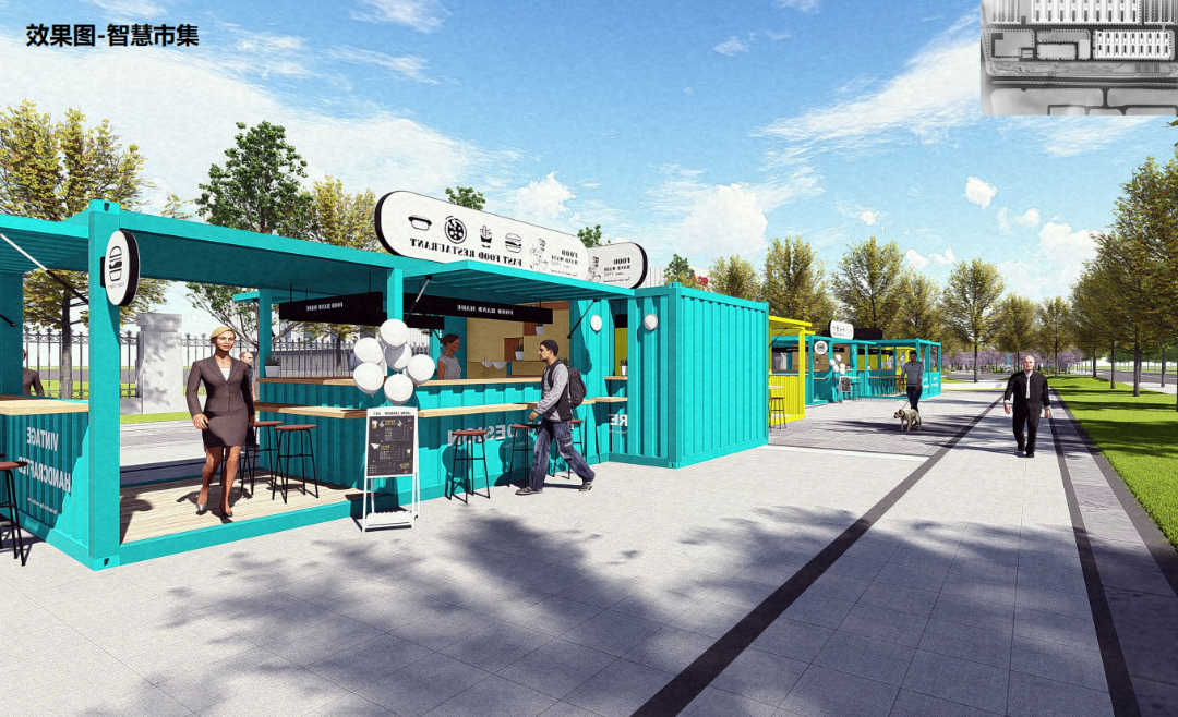革新大道近900米绿荫廊道,将建成可自动喷淋水雾调节温度的智慧跑道,其间多个主题公园区隔出文创、社交、乐活空间。用于生活服务的云集市集,用54个集装箱搭建上下两层、相互连通的时尚商业街。用肖治国的话说,智创小镇要为白领、蓝领人群工作休闲打造一个网红“引力场”。