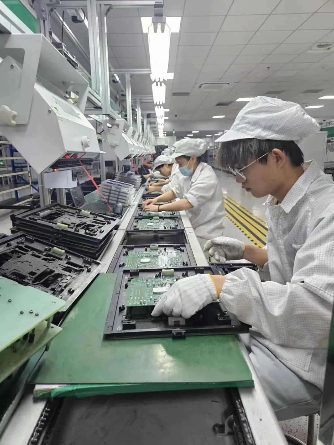 创维平面显示科技有限公司流水线工人正在组装电视机零件。