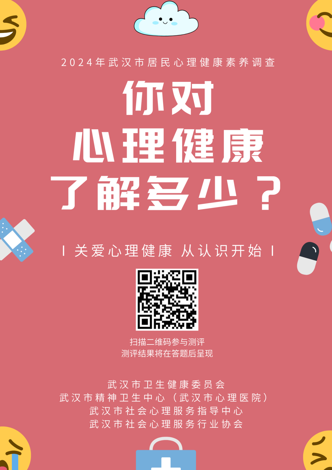 根据《健康中国行动(2019-2030年)》及健康武汉工作要求,为了解武汉市居民心理健康素养水平,武汉市卫生健康委员会、武汉市心理医院组织开展2024年武汉市居民心理健康素养调查。