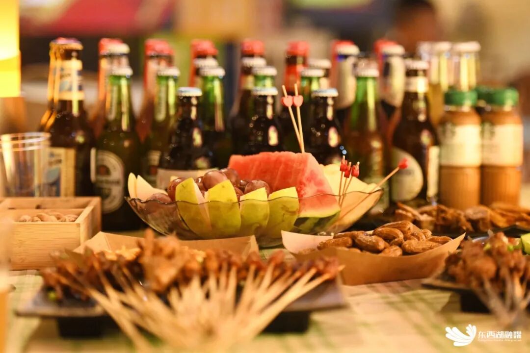 定义为小酒馆,除了主打落日户外的独特氛围,少不了下酒好菜。烧烤和酒是夏夜当仁不让的主角,新鲜的食材,夹裹着厚重的孜然粉,一口下去,鲜香满口。