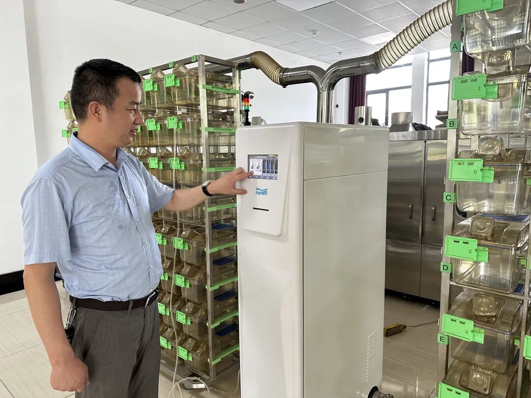 可自动送入清洁空气,将废气集中排放出去的小鼠笼盒;具有清洗、消毒、干燥整套流水线功能的自动化实验动物笼具清洗机……江汉医疗公司办公楼一楼大厅展示着一套由多台设备组成的动物实验室清洗系统。