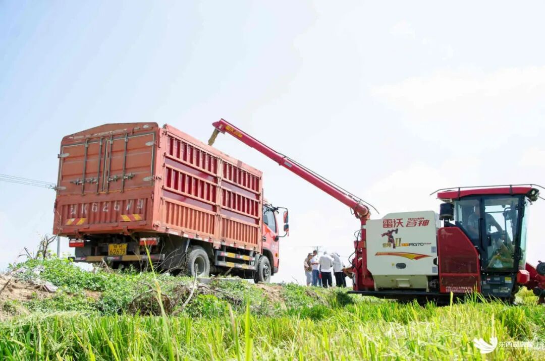 记者现场看到,两台红色雷沃牌谷神联合收割机进入田间,黄绿色的稻田被划出一道道直线,随着收割机继续前行,直线越来越长,稻谷被迅速收割、脱粒,不到10分钟,收割机的谷箱就被装满。