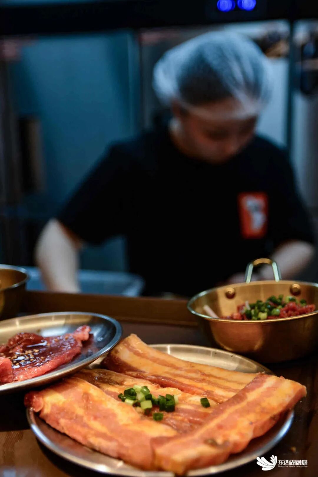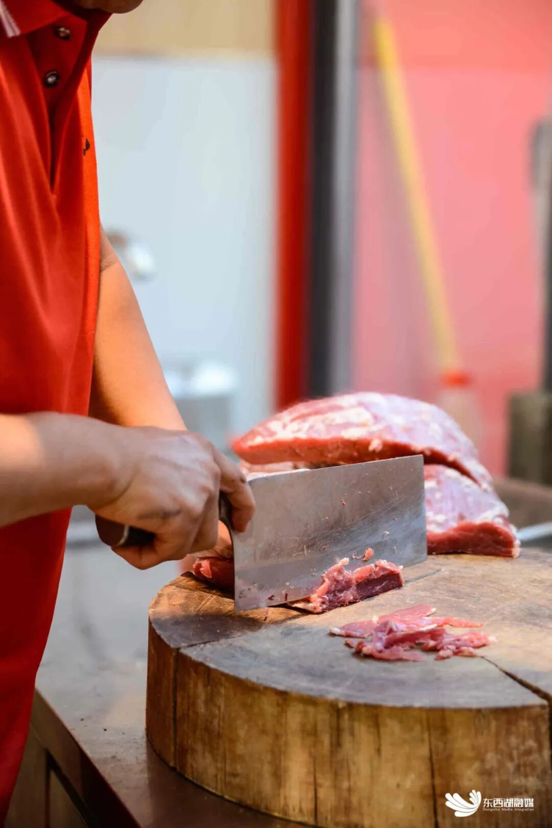 走进店里,最显眼的位置是明档现切牛肉区,大块大块的新鲜牛肉堆在案板上,师傅们忙着切片、串串、摆盘。