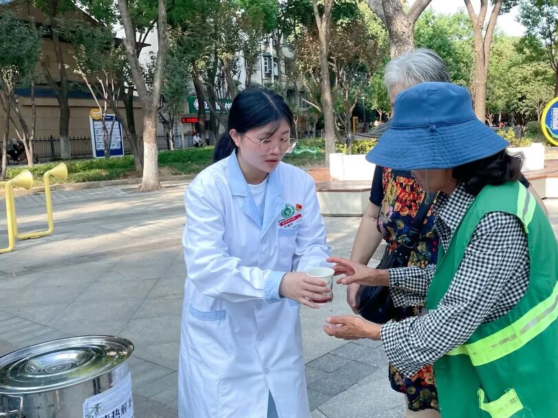 为缓解天气炎热带来的焦虑情绪医护人员特别准备了清热解暑的凉茶和具有中药特色的香囊为居民送去清凉与关怀居民们品尝着凉茶手握着香囊脸上洋溢着满意的笑容对医院的贴心服务表示高度赞赏