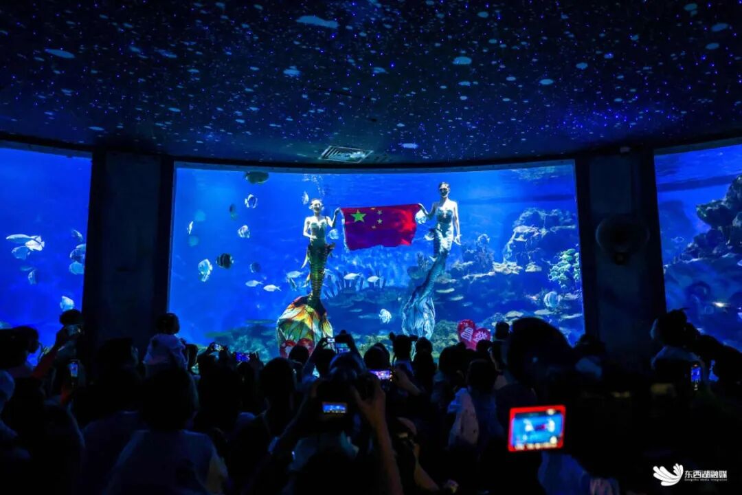 此外,梦幻的人鱼表演也是园区必打卡项目,国庆期间,人鱼表演和礼赞祖国相结合,当美人鱼在水下缓缓升起国旗,中国红与海洋蓝交相辉映,绘制出了最美画卷,游客掌声阵阵,气氛到达了高潮。