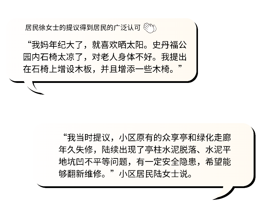 社区广泛收集居民意见后,最终将改造项目确定为翻新众享亭、花园小径和绿化走廊,新增老人休息区和共享花园。在随后的项目设计过程中,居民们就外立面油漆颜色、木椅摆放位置等积极建言献策,与施工单位一起看现场、找点位、商量布局,最终才确定一张张因地制宜的改造施工图。