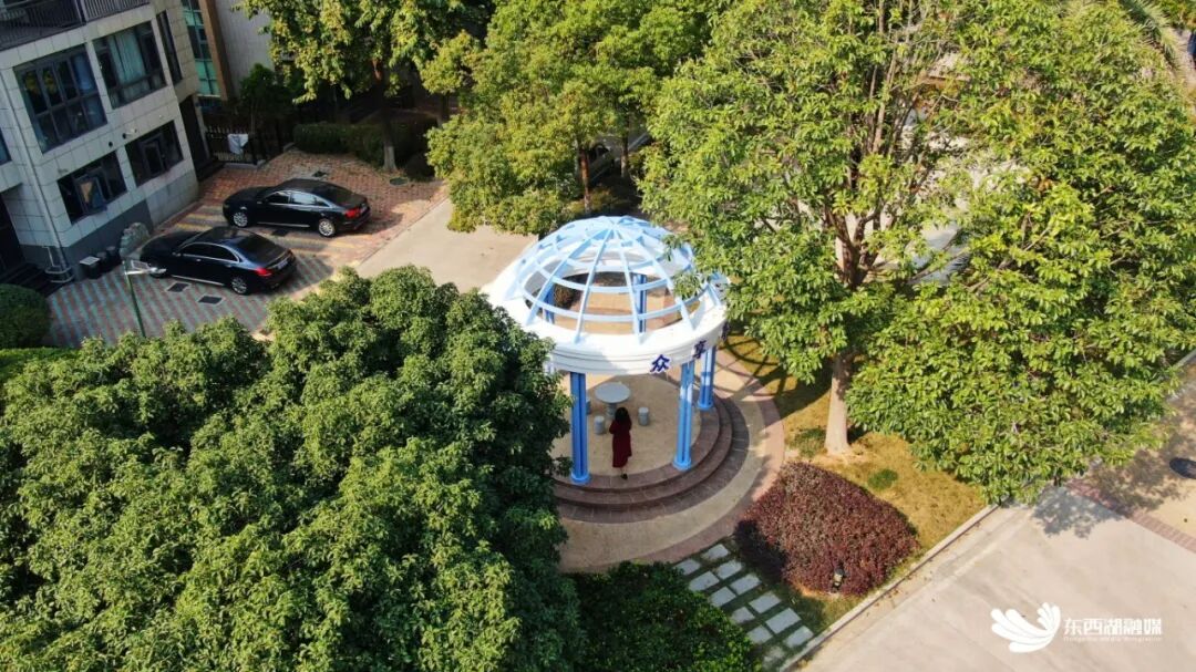 “今天经过小亭子,改造得太美了,这就是人们说的圣托里尼蓝吧,太治愈了,感觉一下子给小区增添了新意和亮点,今后我们一定好好维护!”小区居民陆女士常约小伙伴来亭下喝茶赏景。