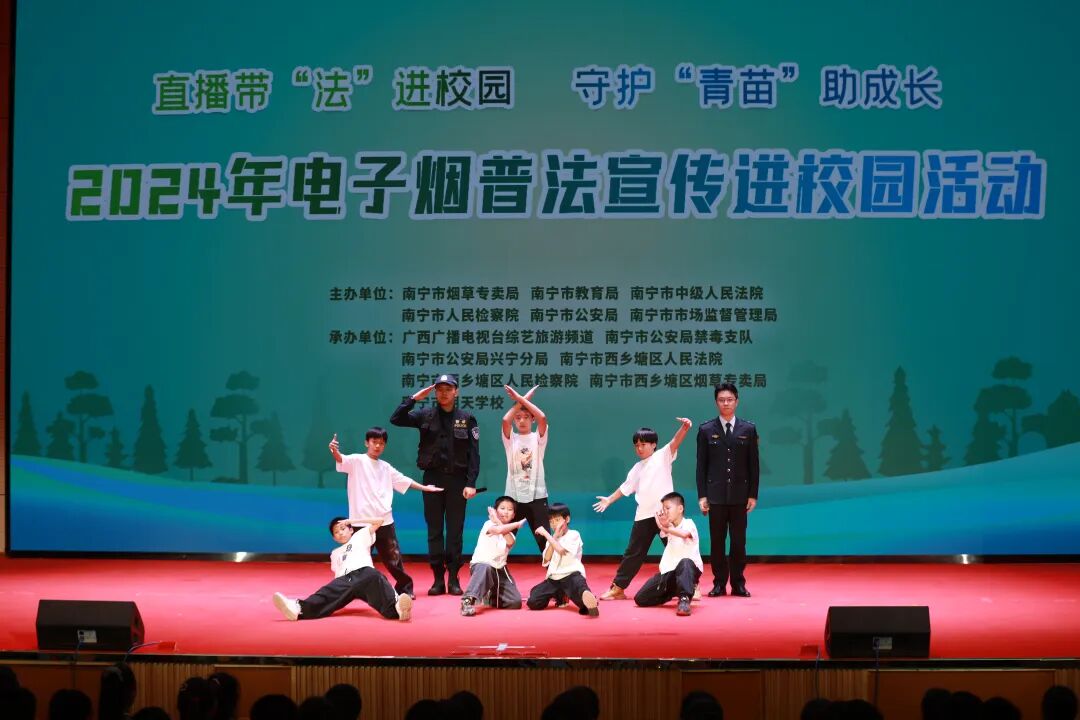 11月20日,广西壮族自治区南宁市烟草专卖局联合市教育局、市中级人民法院、市人民检察院、市公安局、市市场监督管理局,一同走进南宁市明天学校,开展以“直播带‘法’进校园 守护‘青苗’助成长”为主题的电子烟普法宣传进校园活动。
