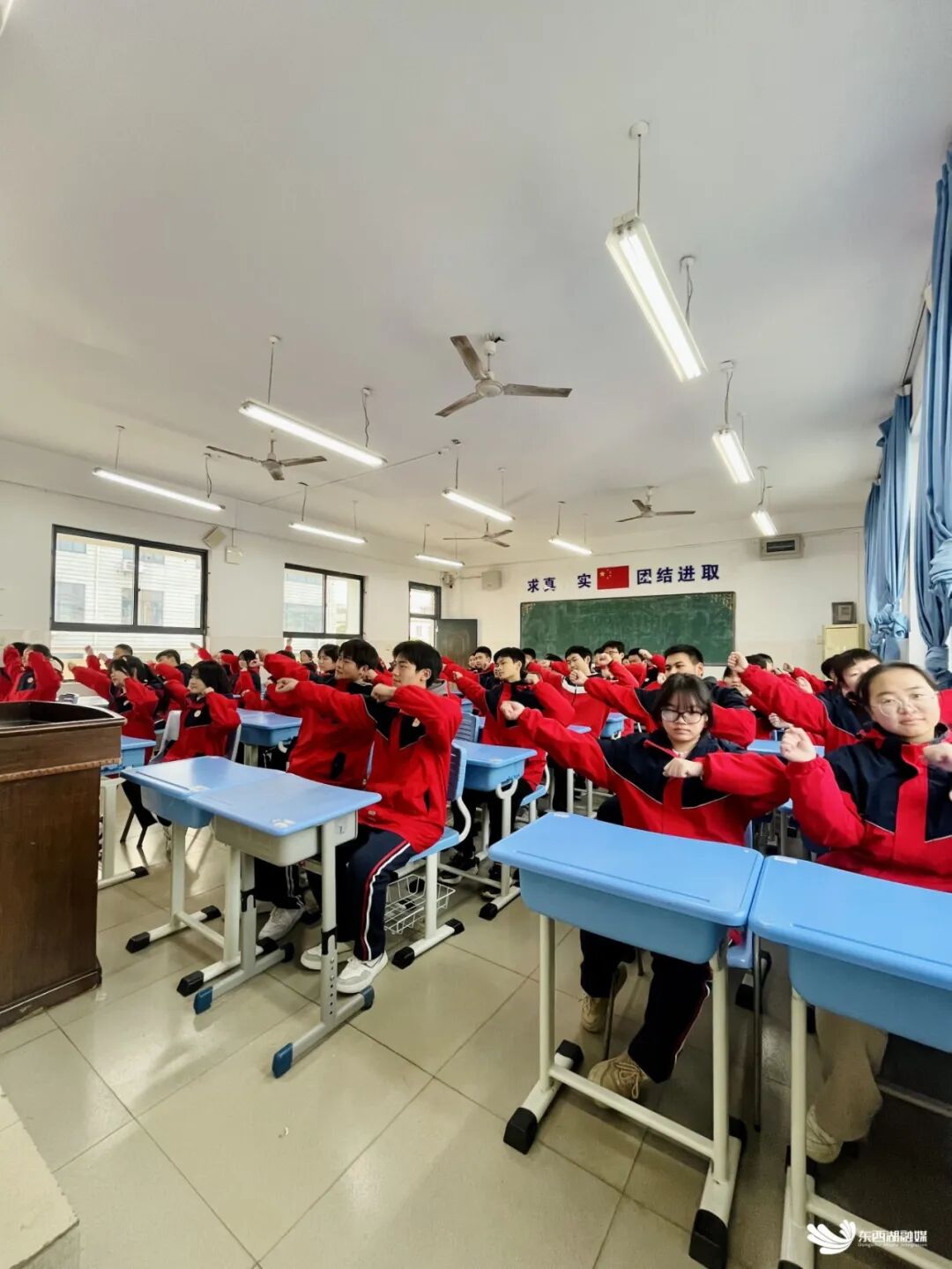 走进高一(1)班,一股青春的气息扑面而来。学生们以课桌为依托,或挥臂、或击桌、或鼓掌,一系列连贯而富有节奏的动作整齐划一,仿佛整个教室都随着他们的节奏在舞动。